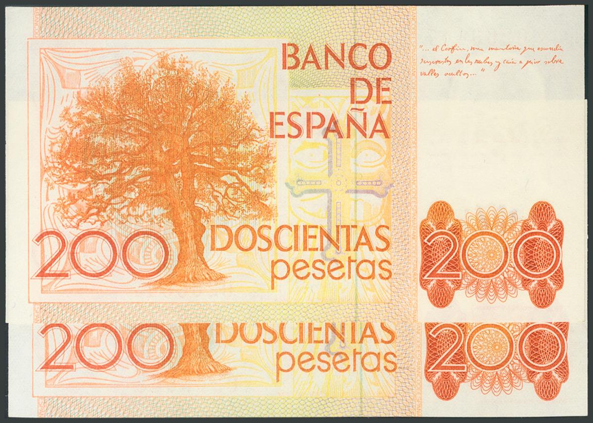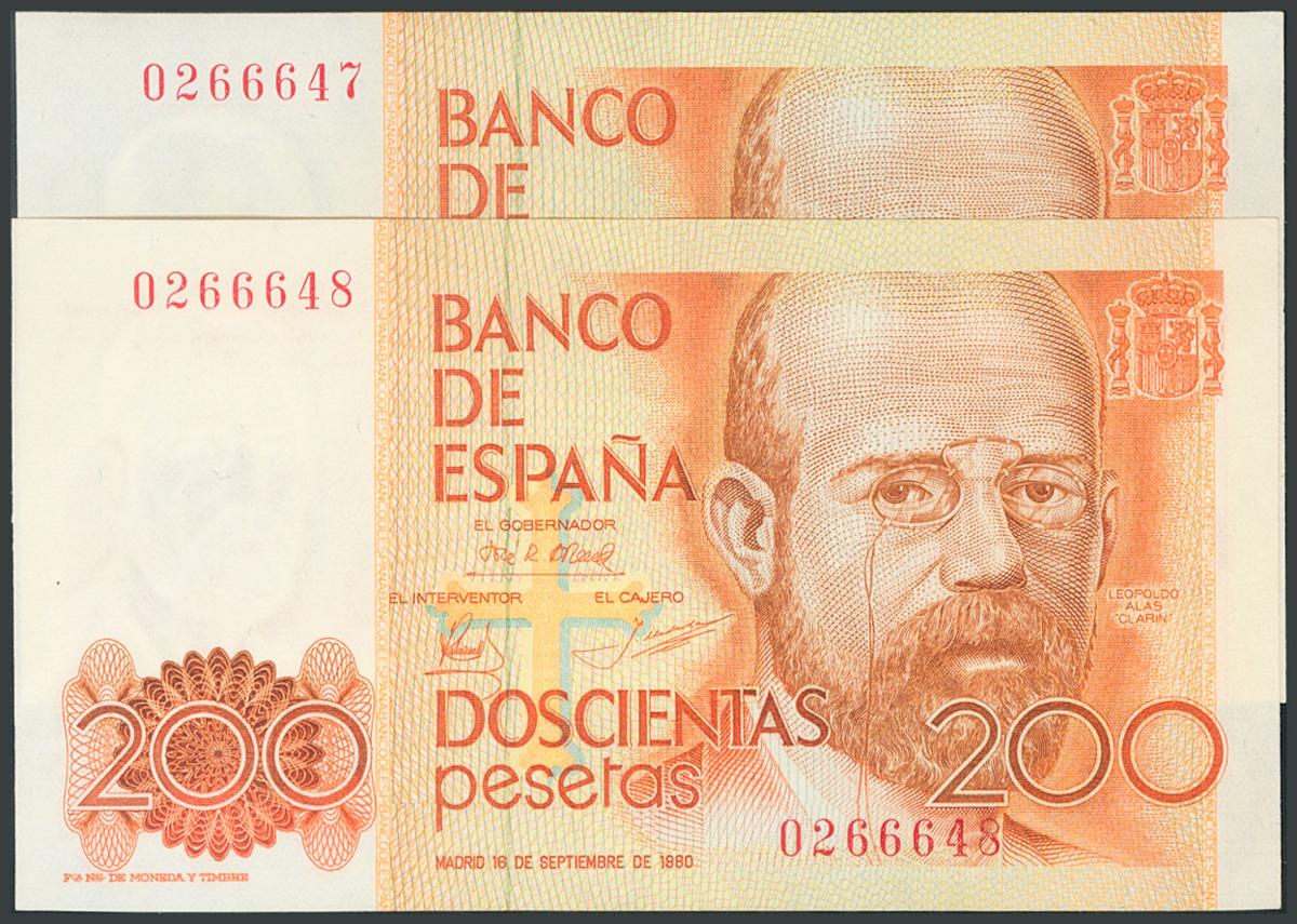 200 pesetas. September 16, 1980. Correlative pair. No series and low numbering. (Edifil 2017: 480). UNC.