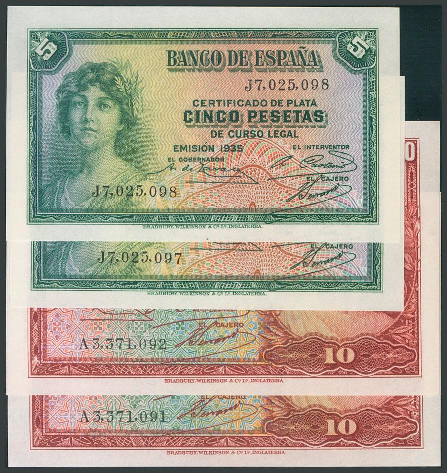 Set of 2 correlative pairs of 5 Pesetas and 10 Pesetas issued in 1935 and with series J and A, respectively (Edifil 2017: 363b and 364a). Original sizing. UNC.