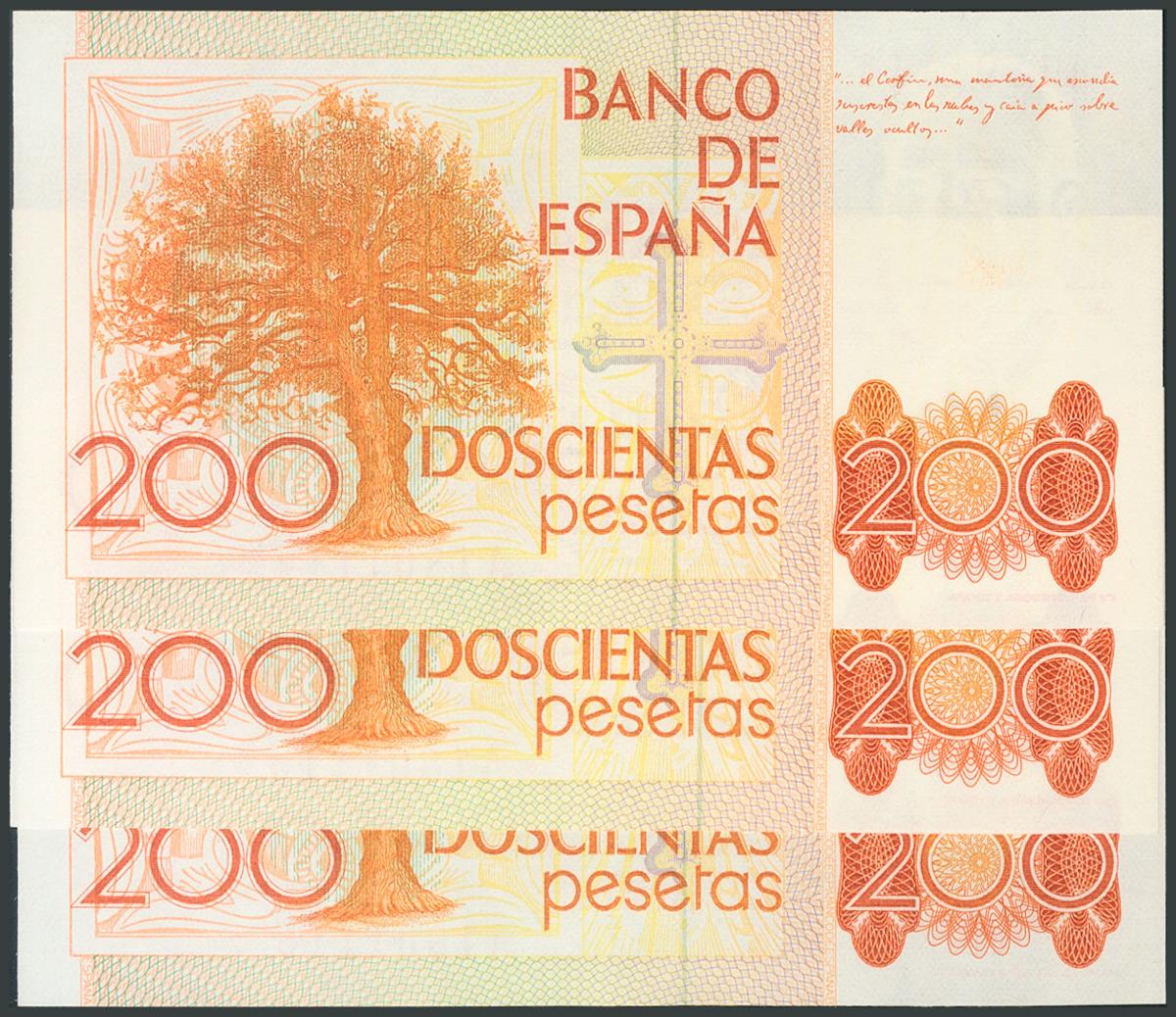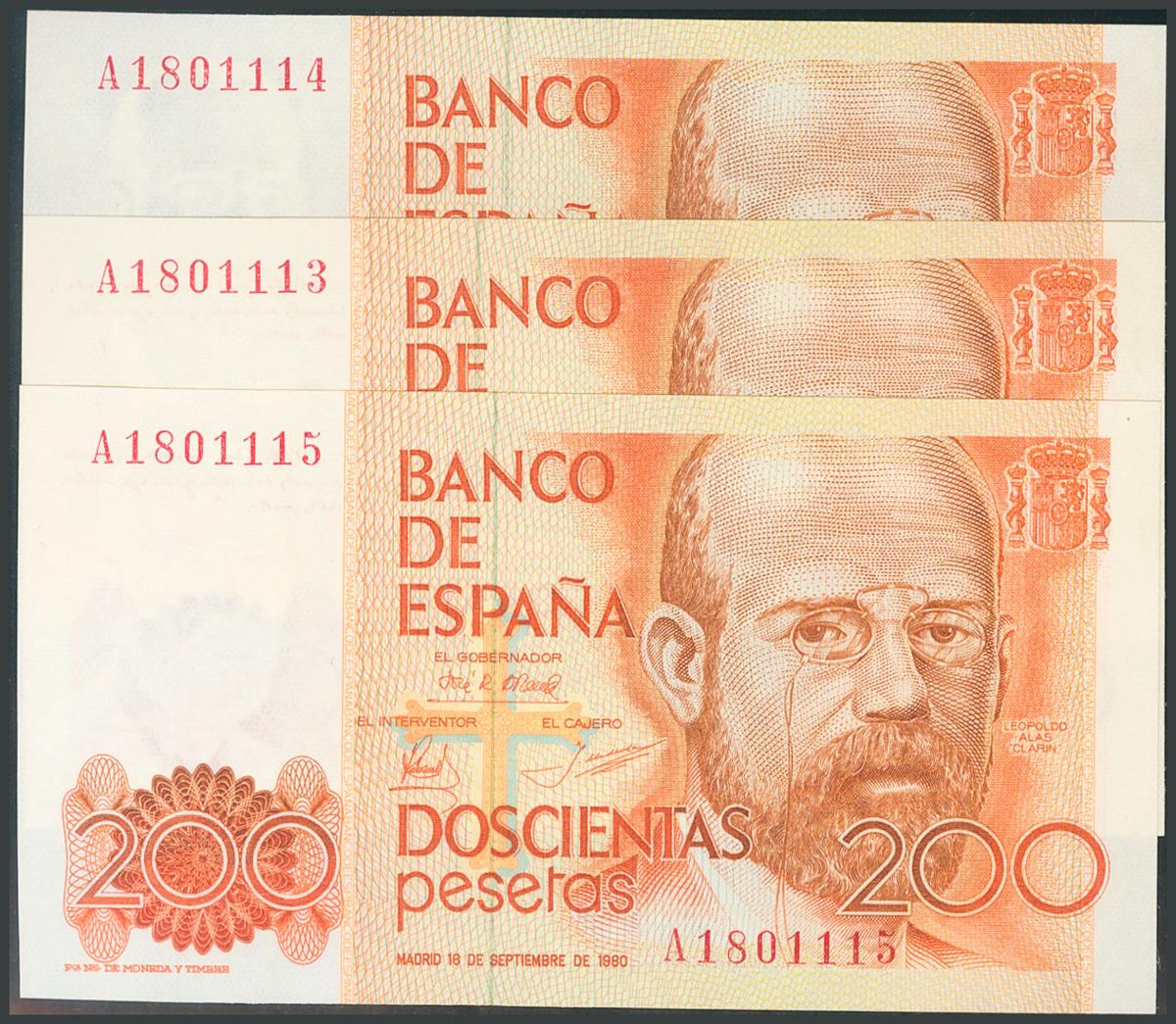 200 pesetas. September 16, 1980. Correlative trio. Series A. (Edifil 2017: 480a). UNC.