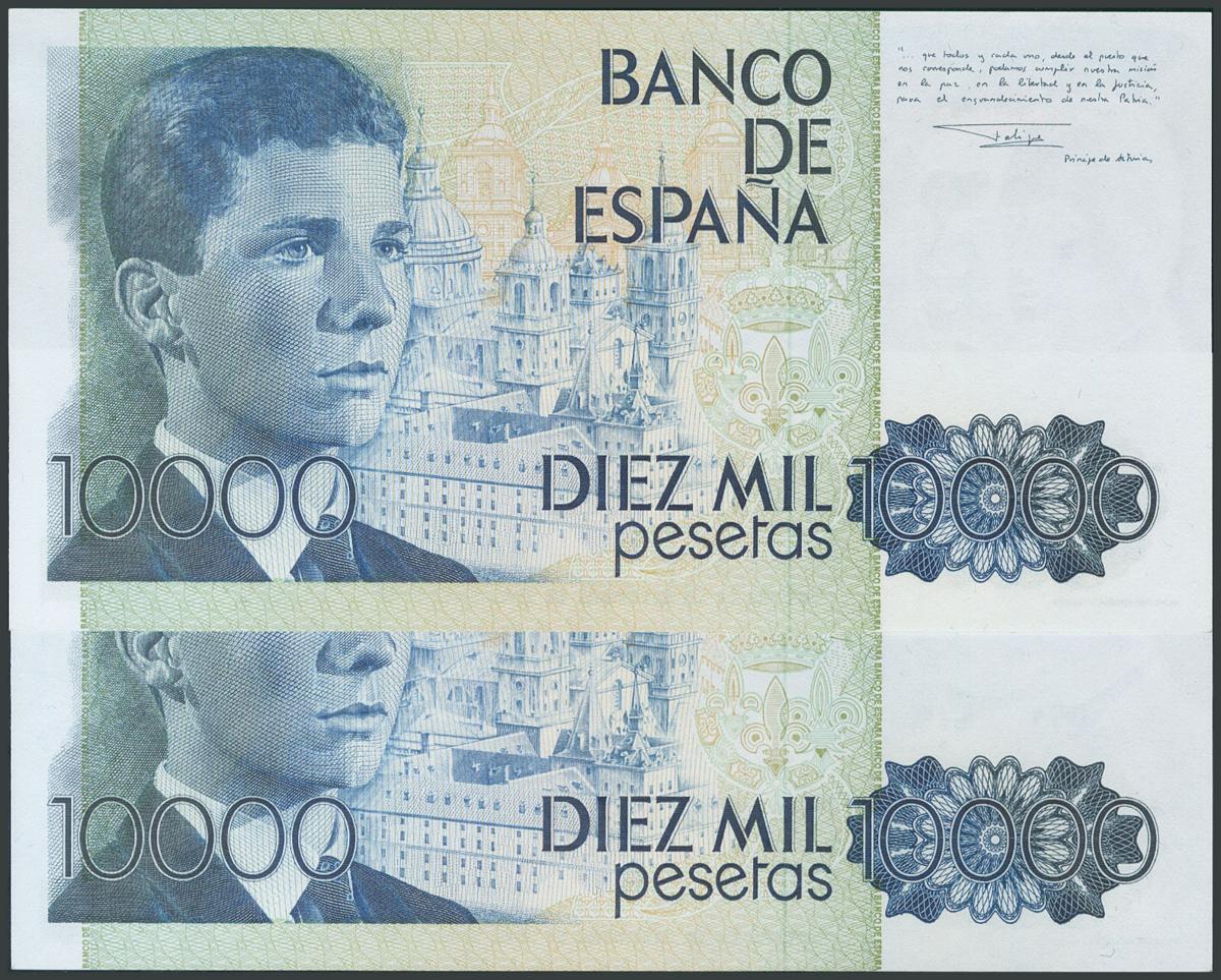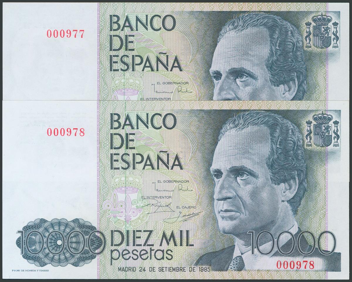 10000 Pesetas. September 24, 1985. Correlative pair. No series and very low numbering. (Edifil 2017: 481). UNC.