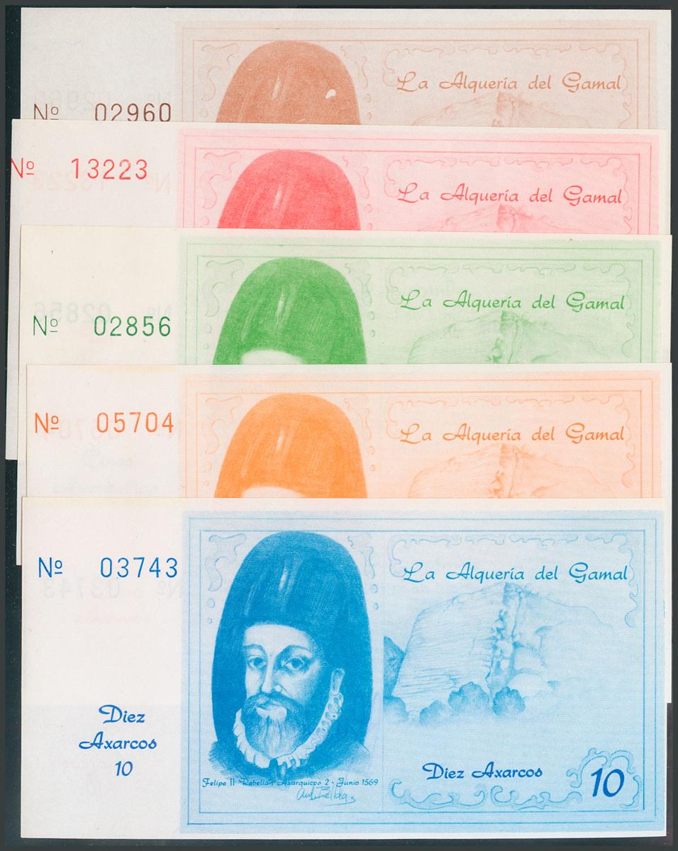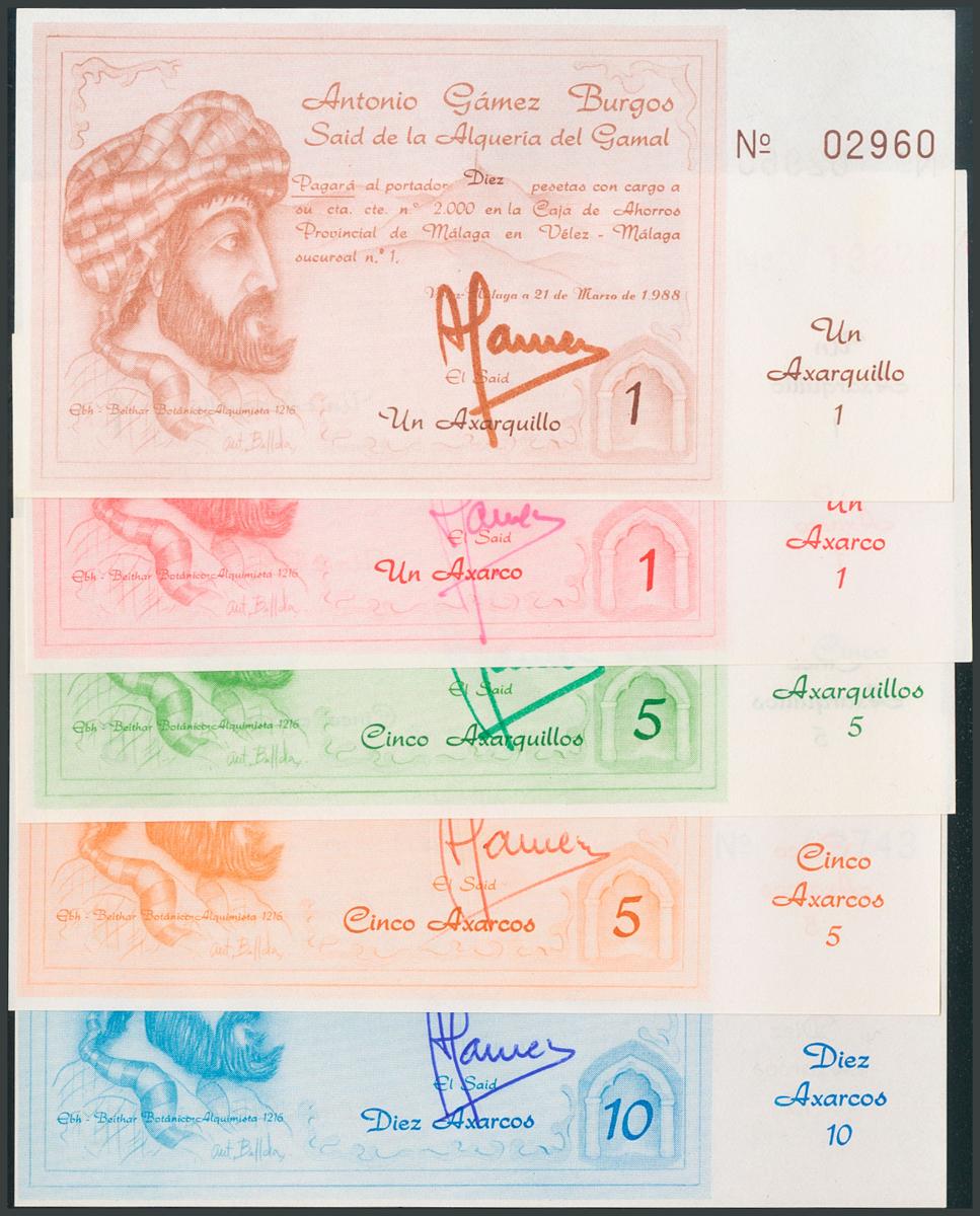Series of 5 banknotes of 1 and 5 Axarquillos and of 1, 5 and 10 Axarcos. March 21, 1988. Vélez, Málaga. Antonio Gámez Burgos, Said of the Gamal Archery. UNC.