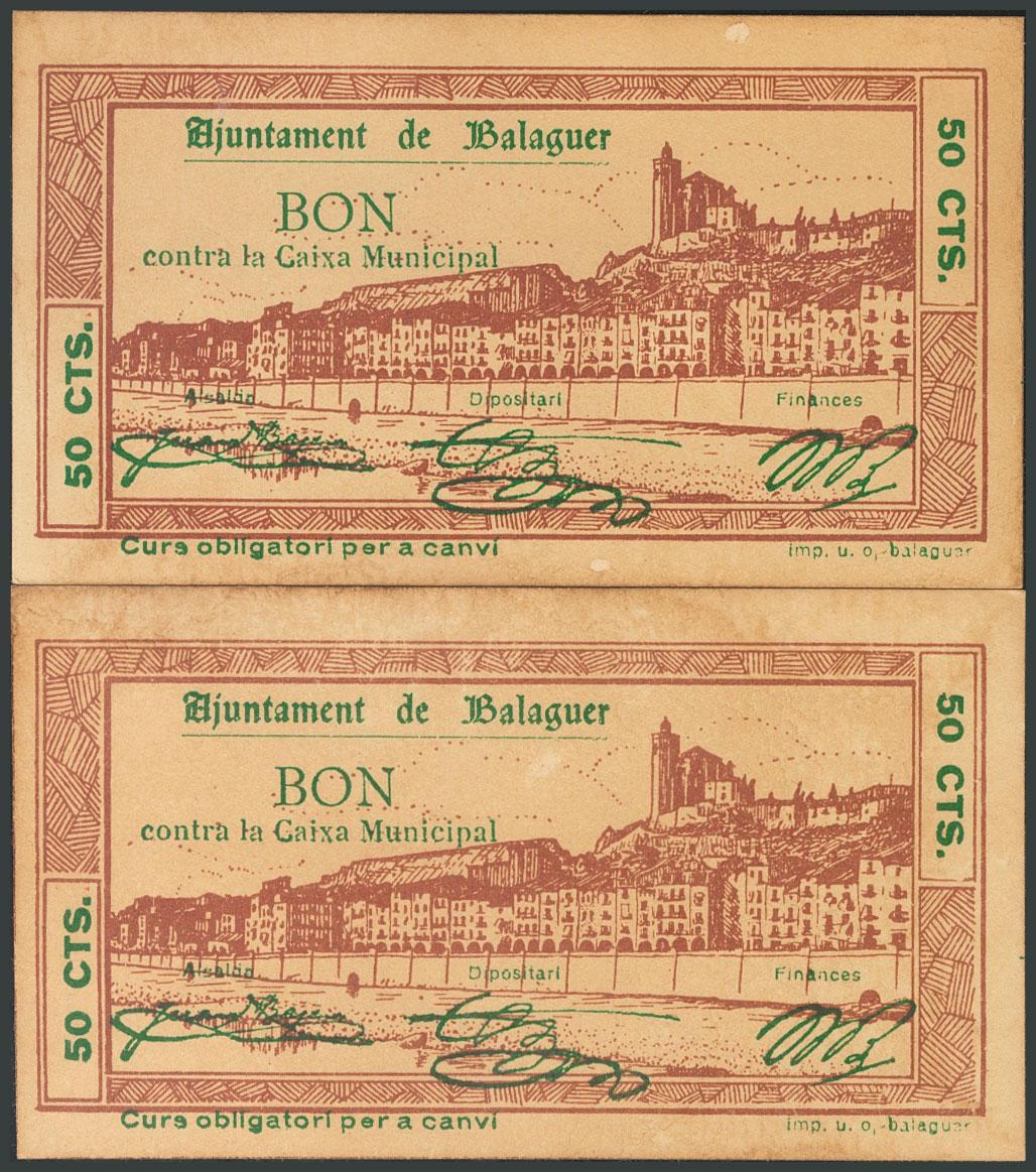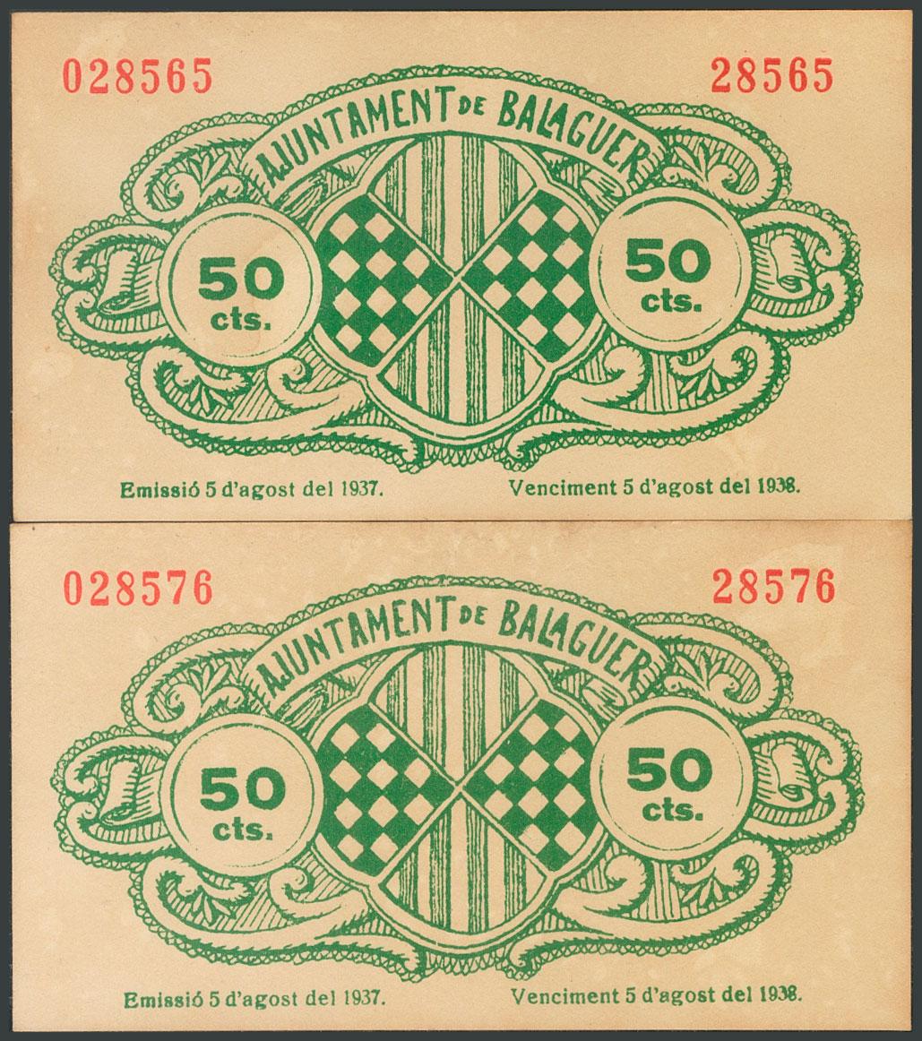 BALAGUER (LERIDA). 50 Cents, two bills with very close numbers. August 3, 1937. (González: 6487). AU.
