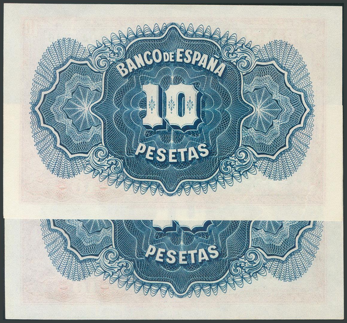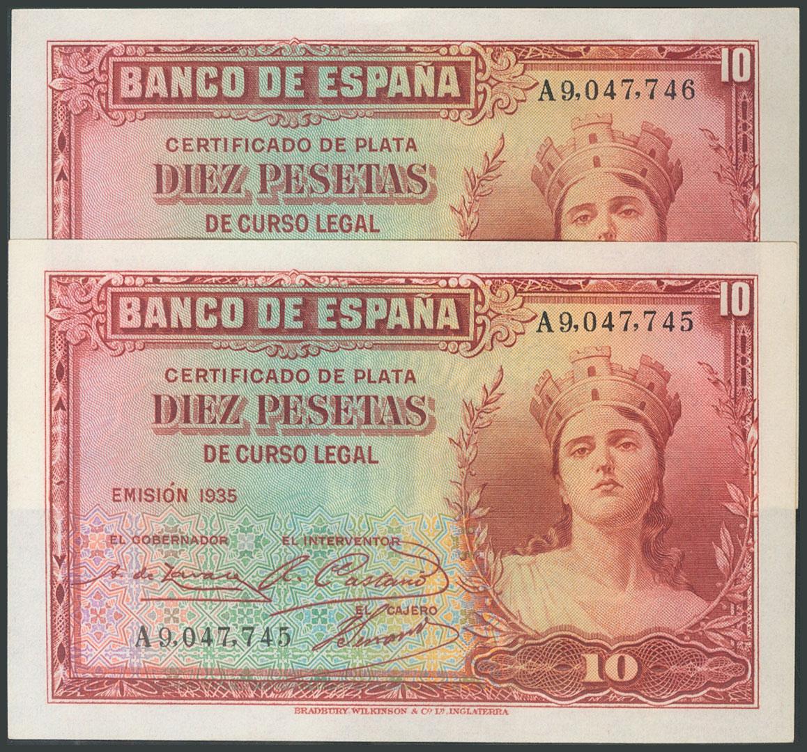 10 pesetas. 1935. Correlative couple. Series A. (Edifil 2017: 364a). Original sizing. UNC.
