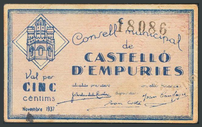 CASTELLO D´EMPURIES (GERONA). 5 Cents. November 1937. Series C. (González: 7485). VF.