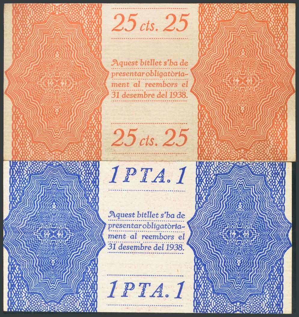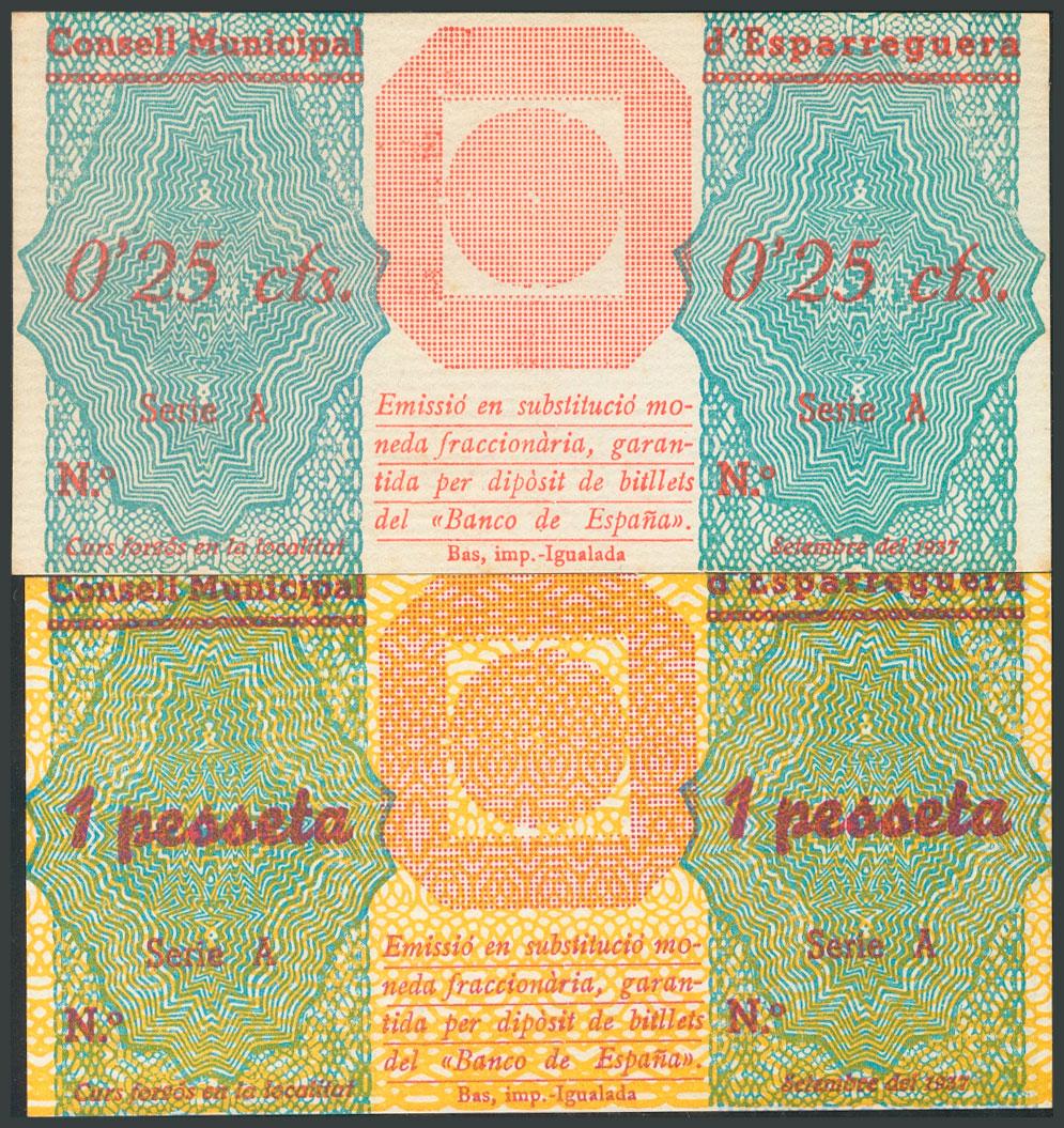 ESPARREGUERA (BARCELONA). 25 Cents and 1 Peseta. September 1937. Series A, both. (González: 7748/49). UNC.