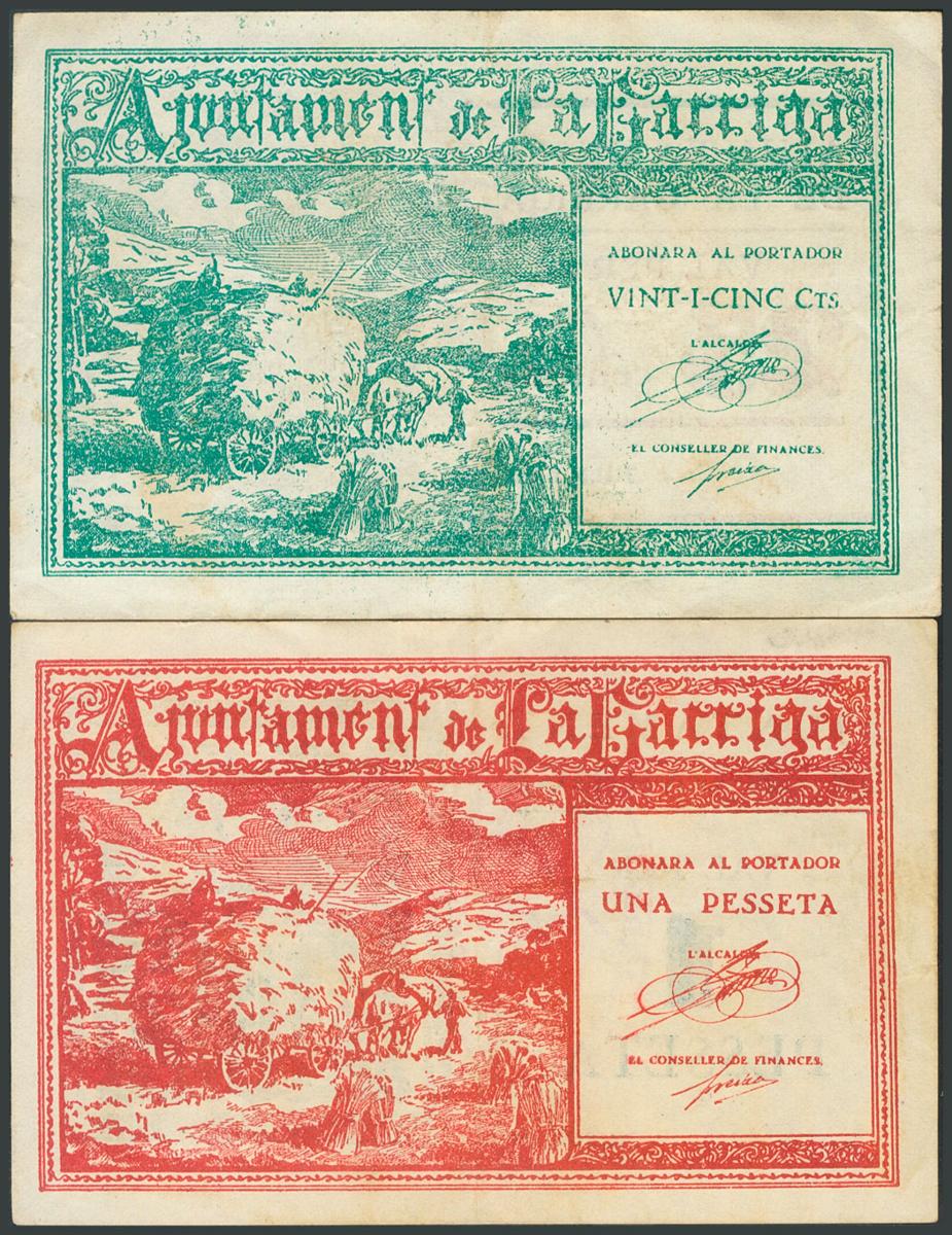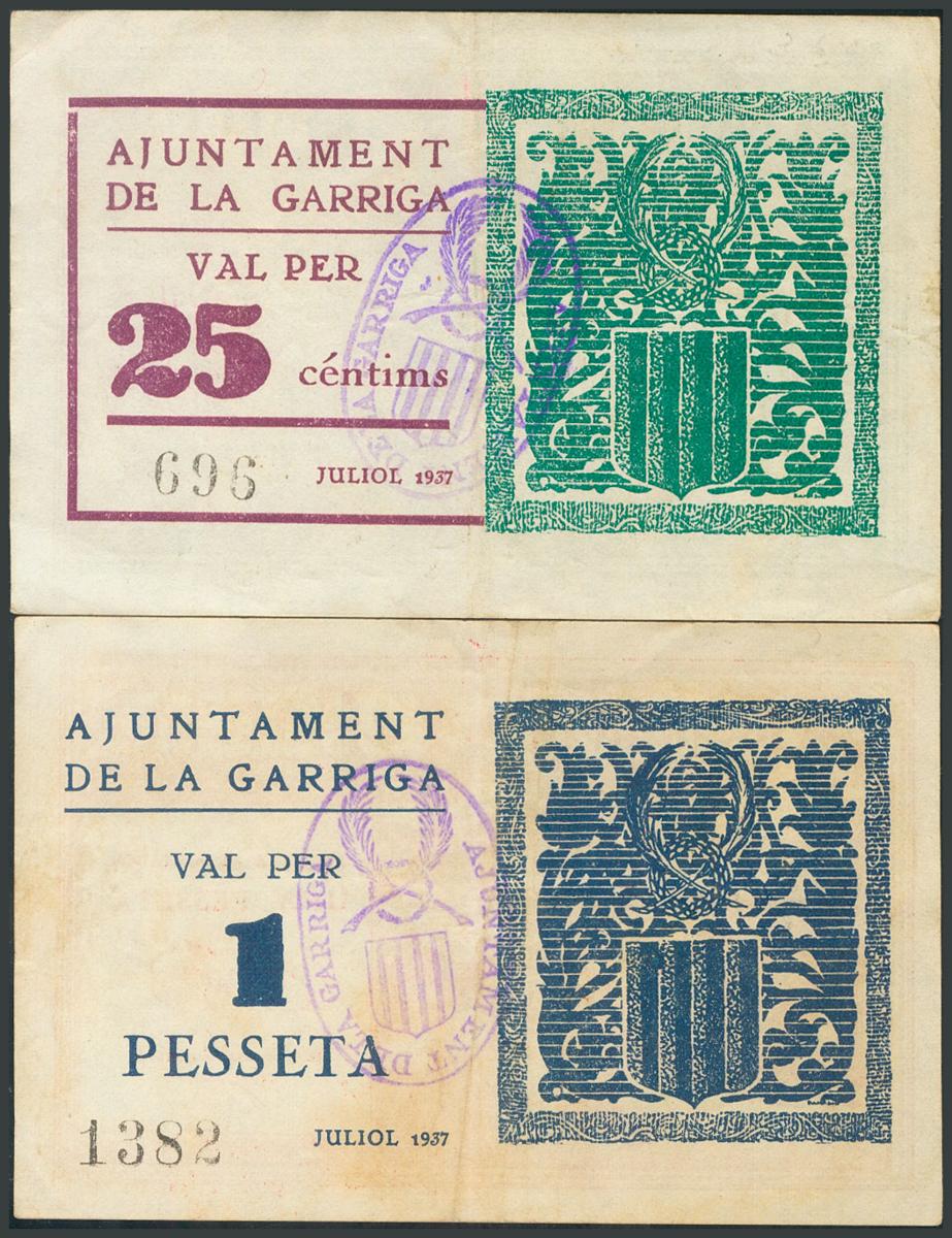 GARRIGA (BARCELONA). 25 Cents and 1 Peseta. July 1937. (González: 7986, 7988). The unusual 25 cts. F.