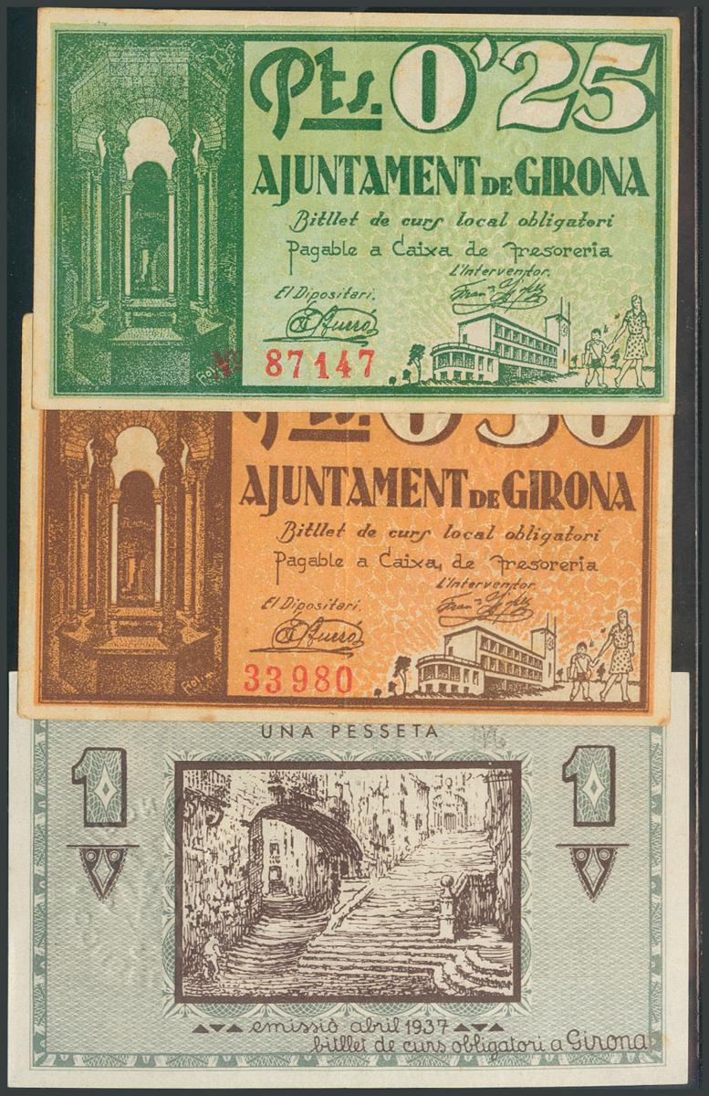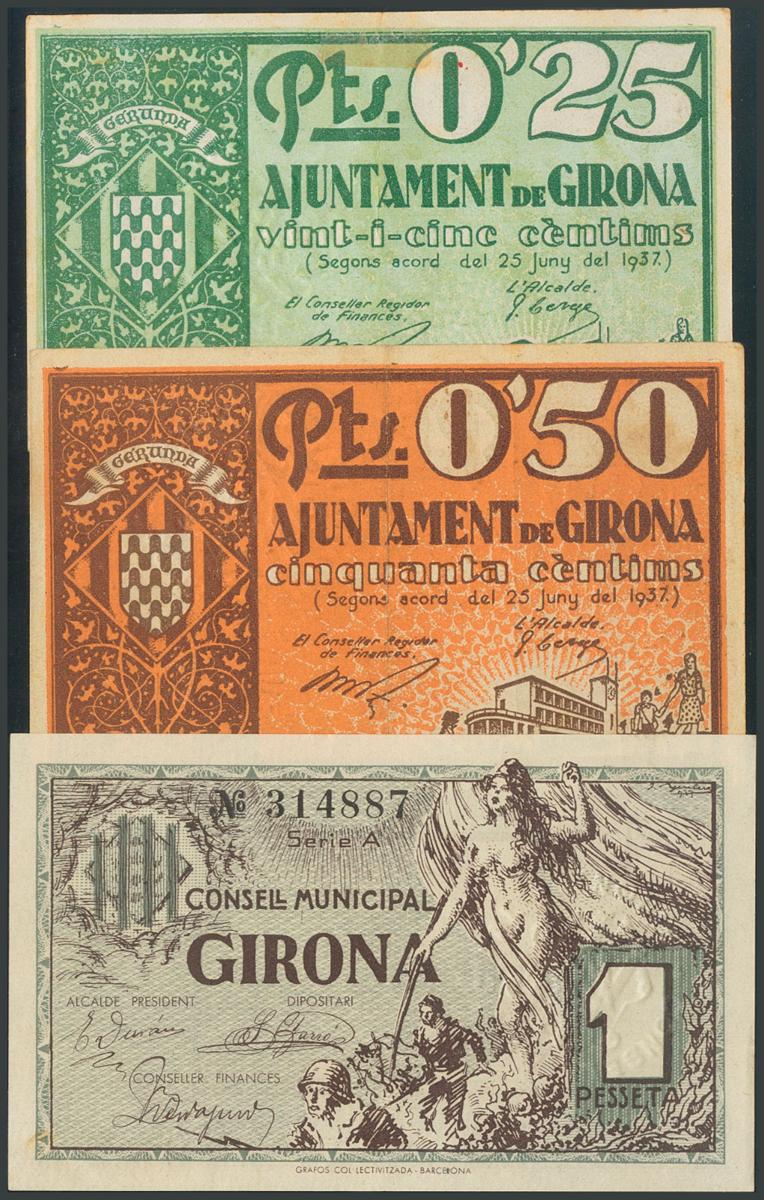 GERONA. 25 Cents, 50 Cents and 1 Peseta. April 1937 and June 1937. The 1 pts series A. (González: 8030, 8031/32). F/ UNC.