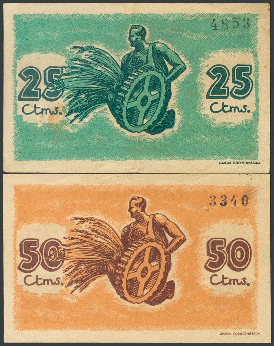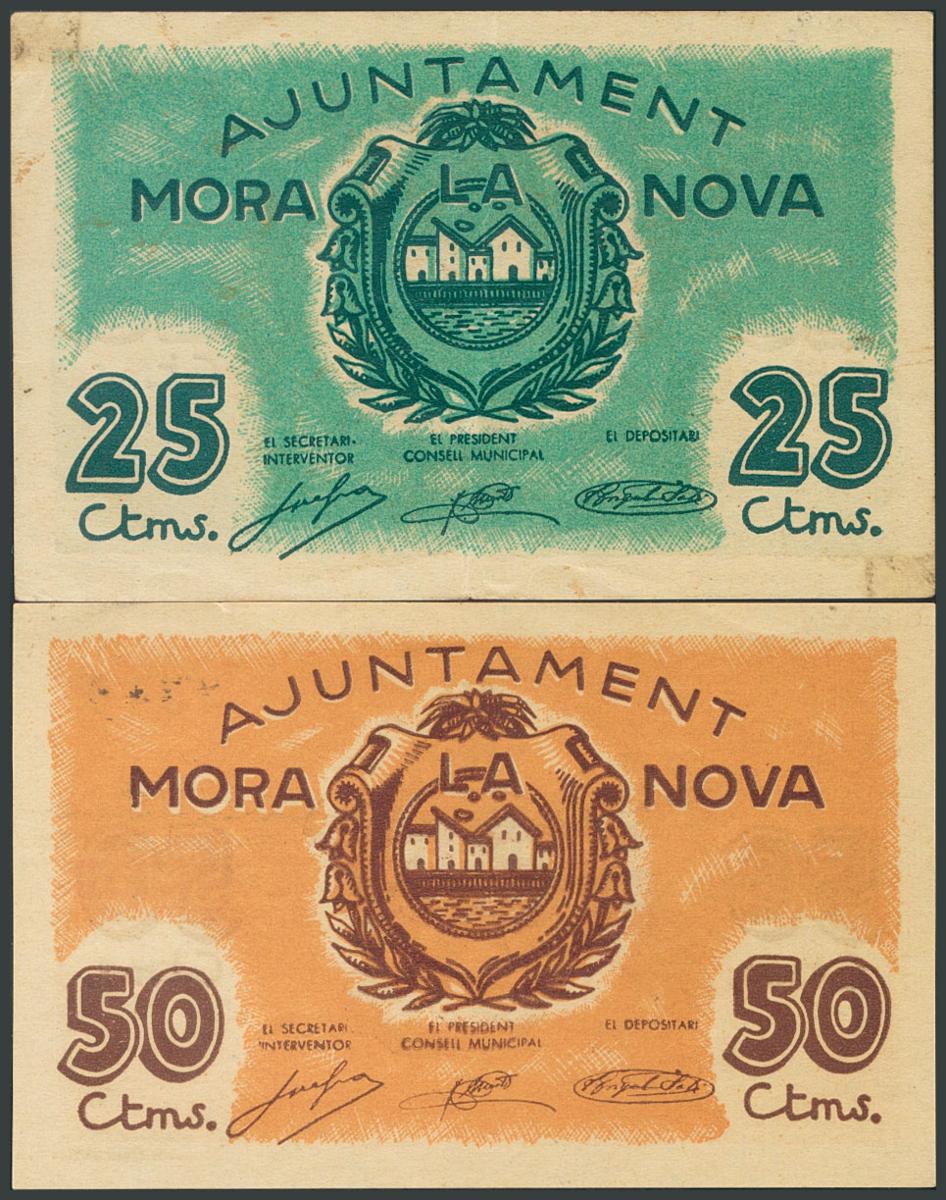 MORA LA NOVA (TARRAGONA). 25 Cents and 50 Cents. (1937ca). (González: 8847, 8848). Unusual VF/ UNC.