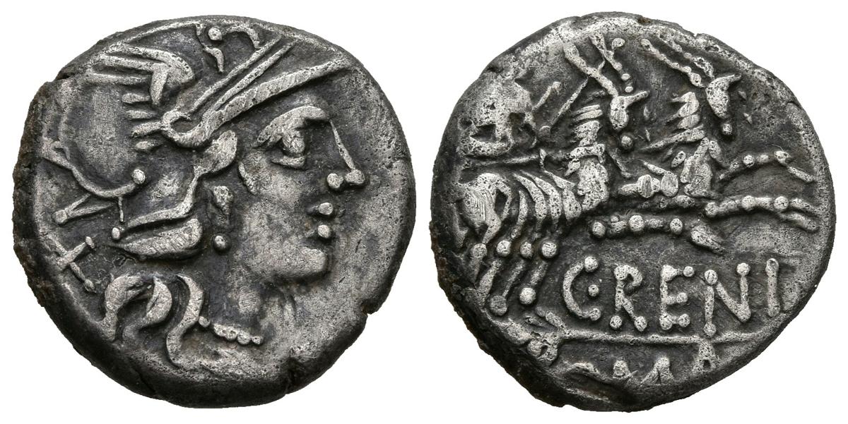 GENS RENIA. Denarius. (Ar. 3.78g / 16mm). 138 BC Rome. (Crawford 231/1; FFC 1088). Anv: Head of Rome to the right, behind X. Rev: Juno Caprotina on biga advancing to the right by goats, below keyenda: SX Q and ROMA below exergue. F.