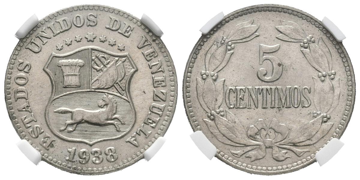 English UNITED STATES OF VENEZUELA. 5 Cents. (CuNi. 2.30g / 19mm). 1938. Philadelphia. (Km # Y27). NGC MS-63 package.