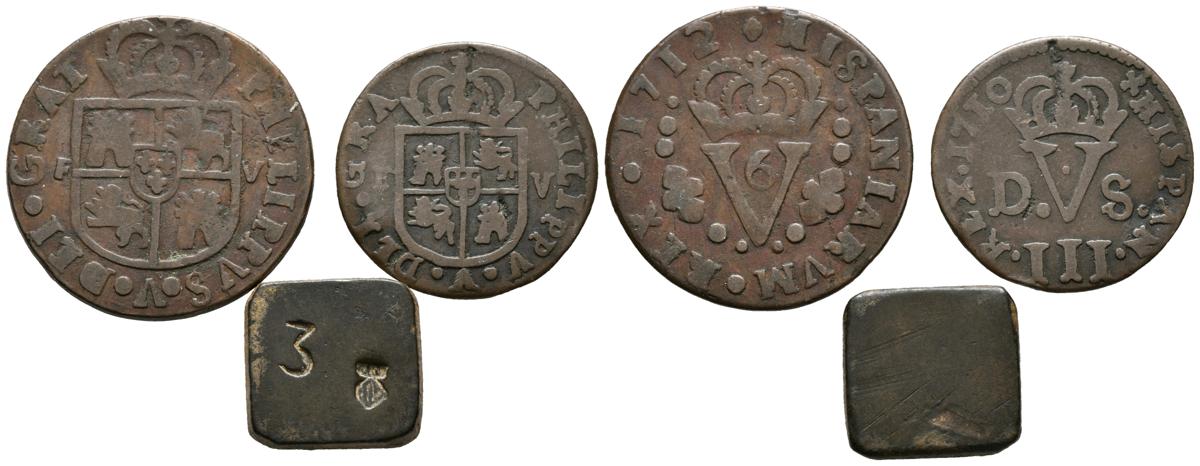 SPANISH MONARCHY. Interesting set consisting of 3 pieces, 1 Treseta and 1 Sisé de Valencia by Felipe V and 1 Valencian ponderal. Different states of conservation. TO EXAMINE.