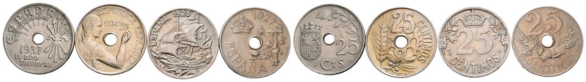 English SPANISH STATE. Precious set formed by 4 coins of 25 Cents from different contemporary historical periods: reign of Alfonso XIII, Second Republic and Civil War. Very high degree of conservation. Extraordinary quality. TO EXAMINE