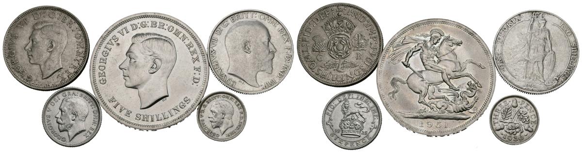 FOREIGN CURRENCIES. Magnificent set of 5 United Kingdom coins, different modules and values with dates between 1902 and 1951. Different states of conservation. TO EXAMINE.