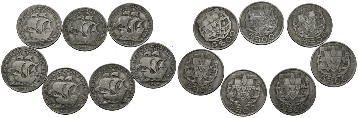 PORTUGAL. Beautiful set of 7 silver 5 Escudos coins dated between 1933 and 1951. Different states of conservation. TO EXAMINE.