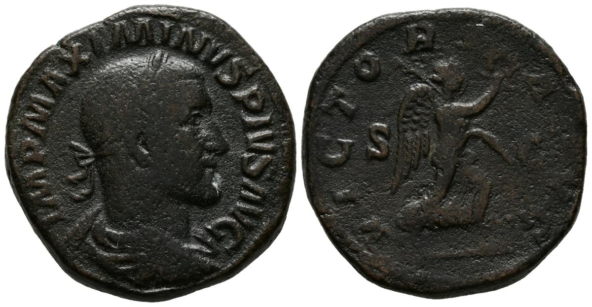 English MAXIMINO I. Sestercio. (Ae. 21.17g / 29mm). 235-238 AD Rome. (RIC 67). Anv: IMP MAXIMINVS PIVS AVG. Laureate and draped bust of Maximino I on the right. Rev: VICTORIA AVG UNC. Victoria advancing to the right with crown and palm. F.