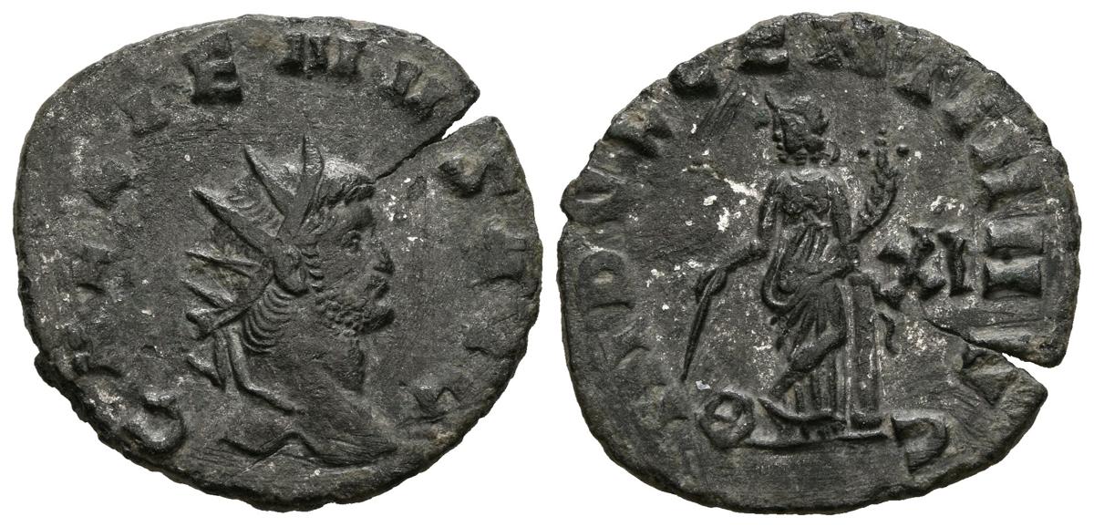 GALLIENUS. Antoninian. (Ae. 2.67g / 21mm). 264-265 AD Rome. (RIC 206). Anv: Radiated bust of Galieno on the right, around legend: GALLIENVS AVG. Rev: Indulgence shelf to left carrying cornucopia and stick, leaning left shoulder on column, behind XI, around legend: INDVLGENTIA AVG. F.