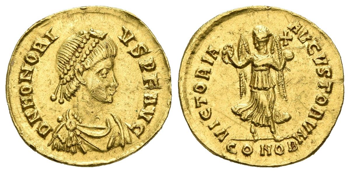 English HONORIUS. Tremisis. (Au 1.31g / 14mm). 408-420 AD Constantinople. Anv: DN HONORIVS PF AVG. Diademic bust, draped and with cuirass to the right of Honorius. Rev: VICTORIA AVGVSTORVM. Victoria shelf cross-legged looking left wearing crown and cruciferous globe. (RIC 212). AU. Rare and precious specimen.