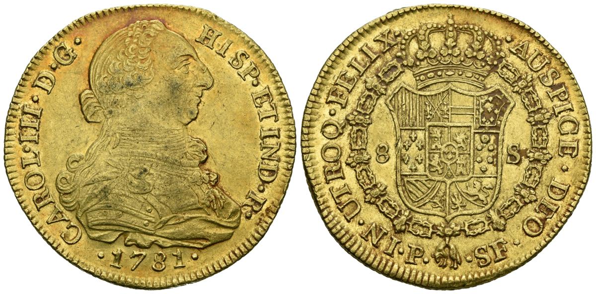 CHARLES III (1759-1788). 8 Shields. (Au. 27.00g / 38mm). 1781. Popayán SF. (Cal-2019-2049). VF. Remnants of original shine.