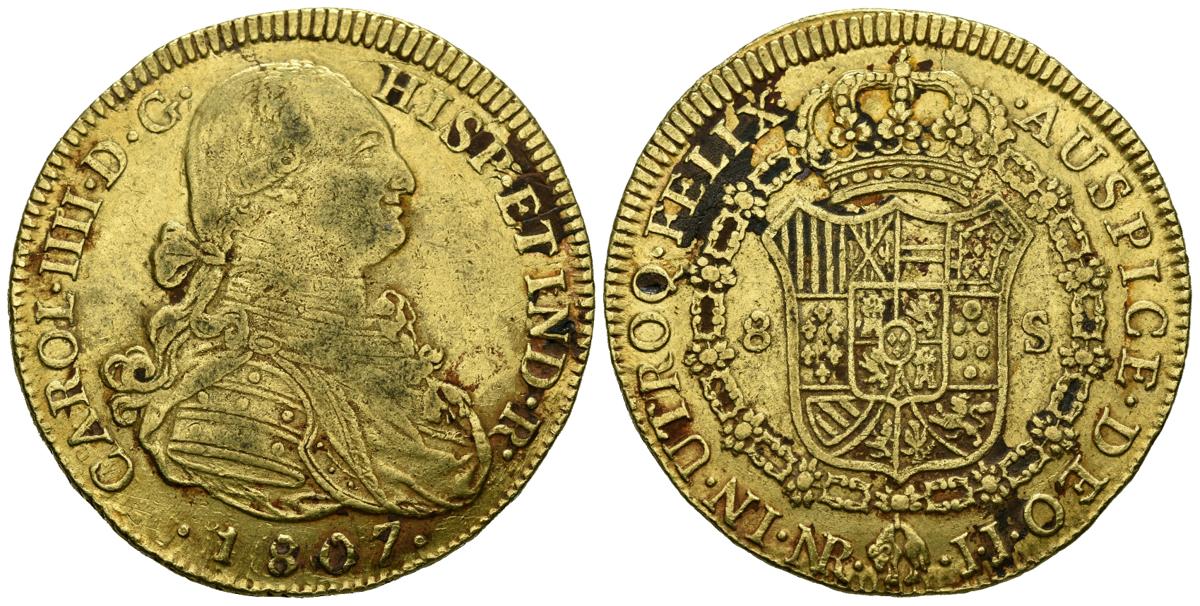 CHARLES IV (1788-1808). 8 Shields. (Au. 26.95g / 37mm). 1807. New Kingdom JJ. (Cal-2019-1748). F. Traces of dirt.