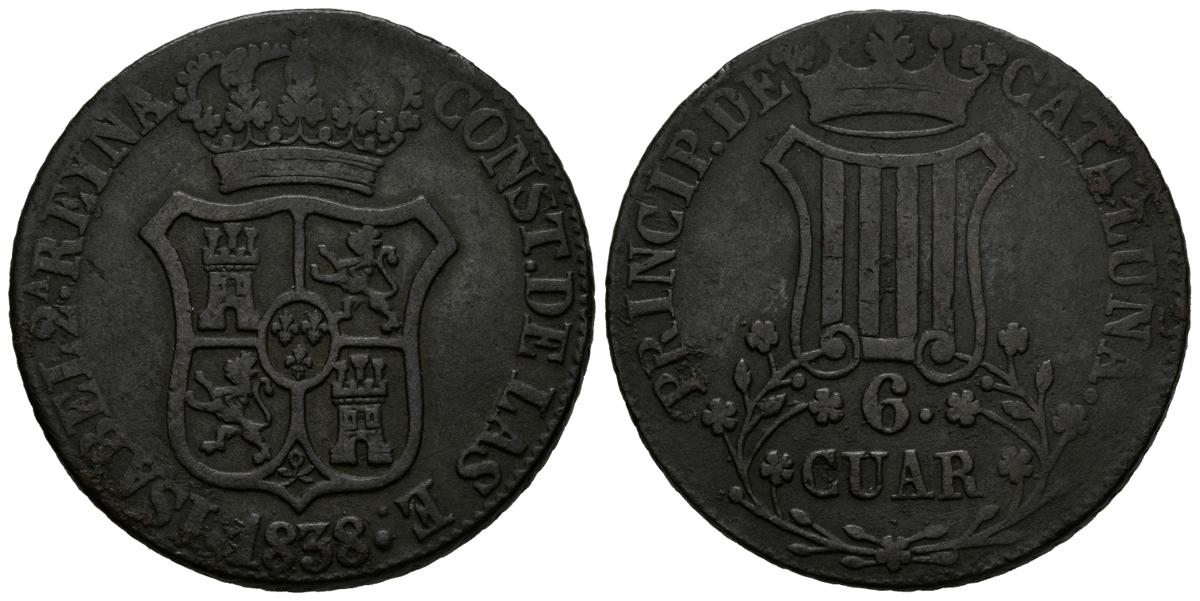 English ISABEL II (1833-1868). 6 Rooms. (Ae. 14.39g / 32mm). 1838. Barcelona. (Cal-2019-18). VG.