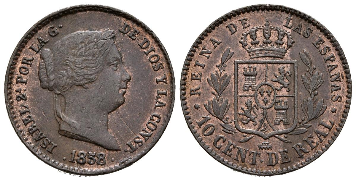 ISABEL II (1833-1868). 10 Real Cents. (Ae. 3.79g / 20mm). 1858. Segovia. (Cal-2019-174). AU. Remnants of original shine.