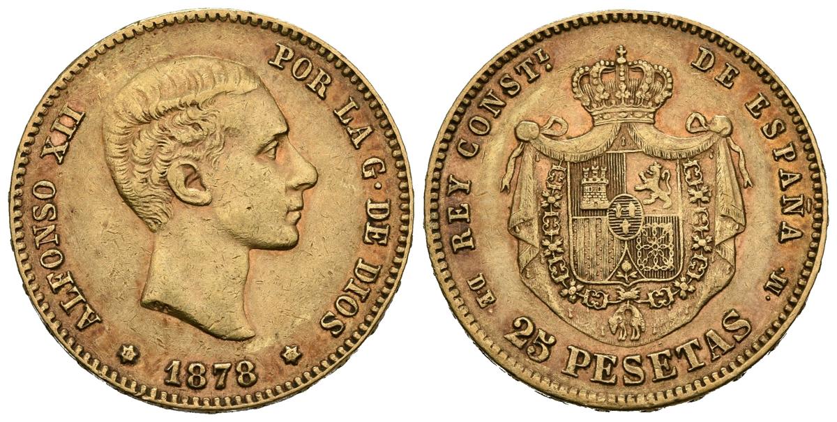 ALFONSO XII (1874-1885). 25 Pesetas. (Au 8.01g / 24mm). 1878 * 18-78. Madrid DEM. (Cal-2019-70). VF. Second loose star. Remnants of original shine.
