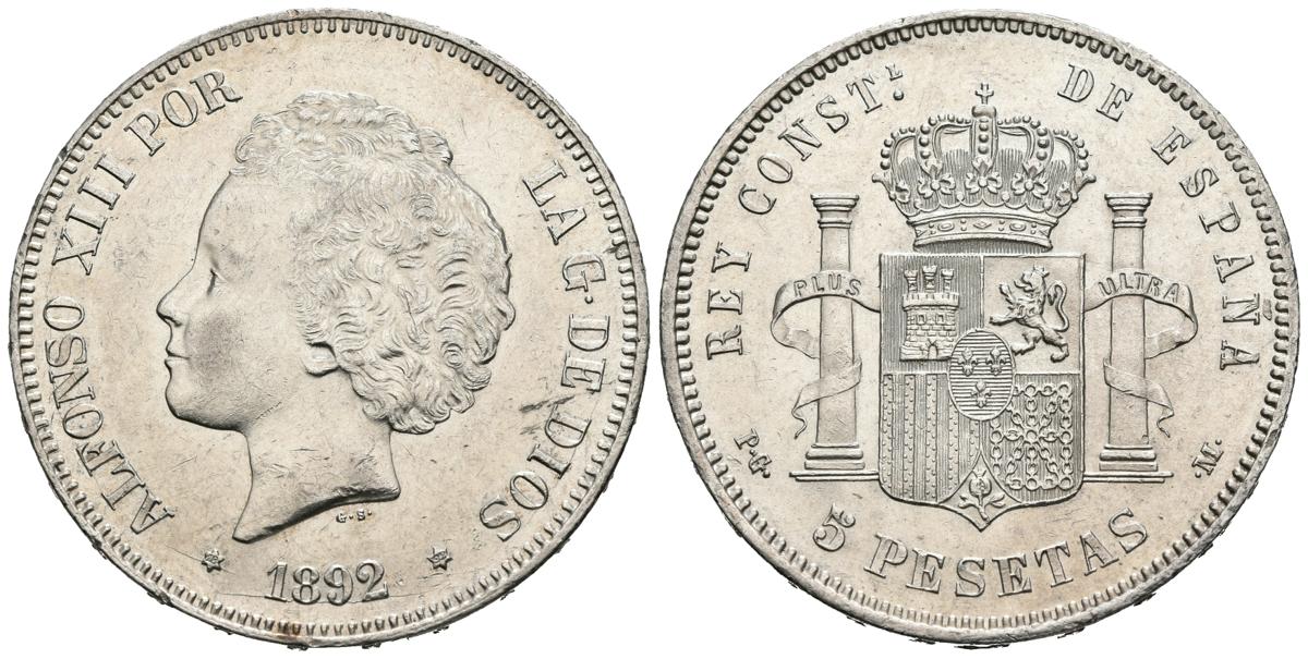 English ALFONSO XIII (1885-1931). 5 Pesetas. (Ar. 25.11g / 37mm). 1892 * 18-92. Madrid PGM. (Cal-2019-100). AU. Scratch cleaning. Little taps on the edge.