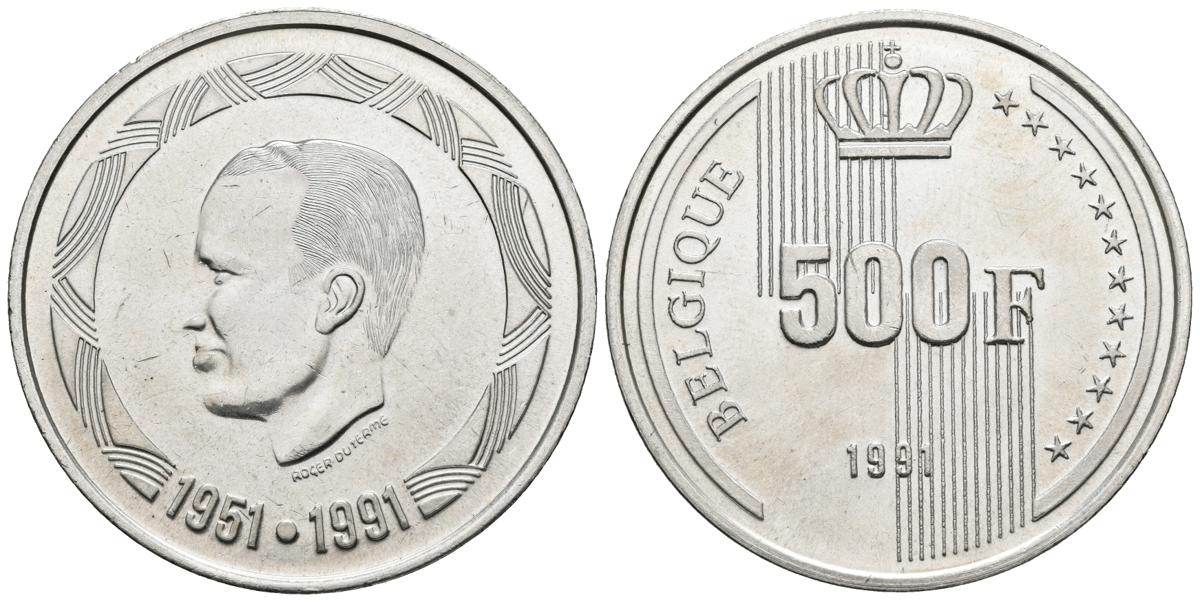 BELGIUM. 500 Francs. (Ar. 22.85g / 37mm). 1991. 40th Anniversary of the Reign of King Baudouin. Legend in French. (Km # 197). UNC.
