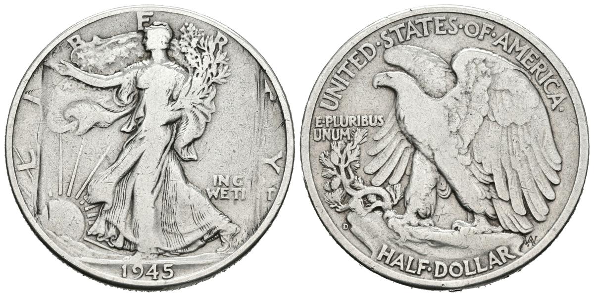 English U.S. 1/2 Dollar. (Ar. 12.20g / 30mm). 1945. Denver D. (Km # 142). VG.