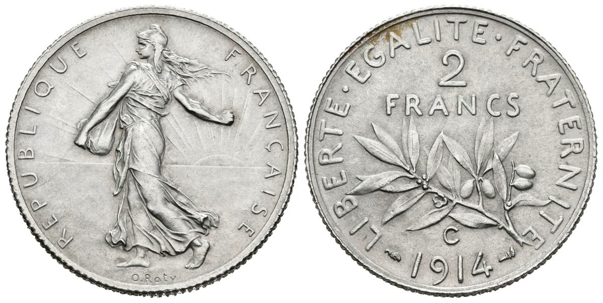 FRANCE. 2 Francs (Ar. 10.00g / 27mm). 1914. C. III Republic. (Km # 845.2). AU.