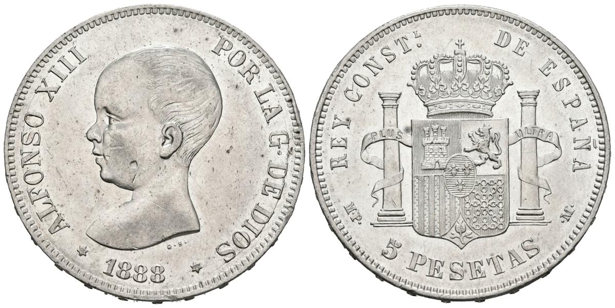 English ALFONSO XIII (1885-1931). 5 Pesetas. (Ar. 25.13g / 37mm). 1888 * 18-88. Madrid MPM. (Cal-2019-92). Almost Extremely Fine.
