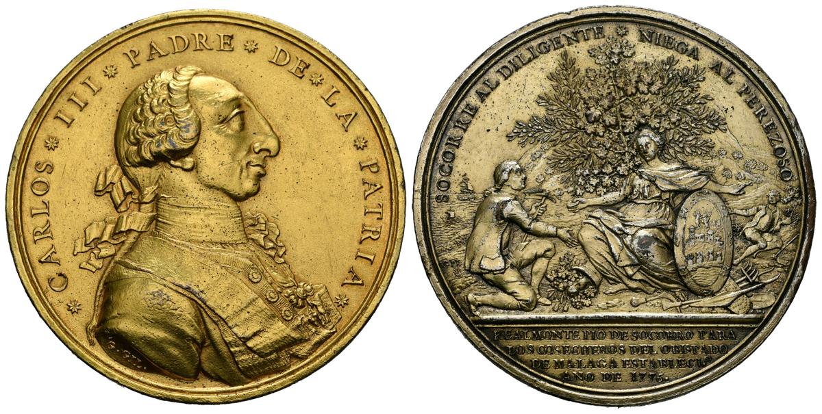 CARLOS III (1759-1788). Creation of the Montepío de Cosecheros of the Bishopric of Malaga. (Gilt bronze. 99.17g / 60mm). 1776. Engraver: GA Gil. (Vives 48; RAH 308-310). Anv: Bust of Carlos III with coat, jabot shirt, band and the collar of the fleece, around the legend: CARLOS III FATHER OF THE COUNTRY. Rev: Malaga seated on the left under olive, fig, almond and grapevines, leaning on the shield of the city in an attitude of rewarding a farmer kneeling before it and disdaining another lying on the ground, cornucopia and farming instruments at his feet, in the background a mountain with vines and olive trees, and to the left the sea, around the legend: HELP THE DILIGENT DENY THE LAZY, in exergoREAL MONTEPIO DE SOCORRO PARA / LOS COSECHEROS DEL OBISPADO / DE MALAGA ESTABLISHMENT / YEAR 1776. Good Very Fine. Two perforations on the edge.