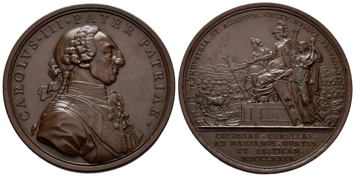 CARLOS III (1759-1788). Establishment of the Sierra Morena colonies. (Ae. 75.13g / 56mm). 1774. Engravers: Tomás F. Prieto and GA Gil. (Vives 46; RAH 306). Anv: bust of Carlos IV with jacket, shirt with jabot, band and collar of the fleece, around legend: CAROLVS III PATER PATRIAE. Rev: Hispania with helmet, map, coat of arms, spears and rabbit at his feet, sitting on a podium to the left, flanked by the personifications of Industry and Agriculture with their attributes, in the background, fields of work where a man of plow with a team of oxen, around legend. INDVSTRIA ET AGRORVM CVLTV VBIQVE PROPAGATIS, in exergue: COLONIAE GEMELLAE / AD MARIANOS MONTES / ET BAETICAM / MDCCLXXIV. Good Extremely Fine. Limited.