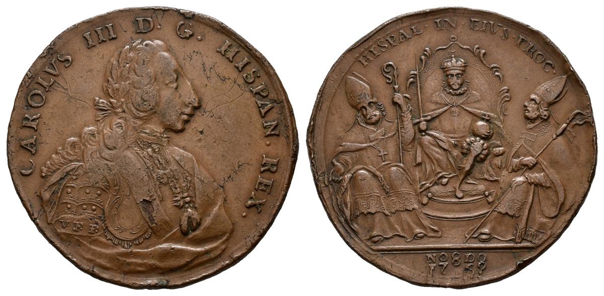 CARLOS III (1759-1788). Sevilla Proclamation. (Ae. 11.50g / 35mm). 1759. Engraver: V. de la Fuente. (You Vives 33). Anv: Laureate bust of Carlos III with breastplate, band, mantle and collar of the fleece, around legend: CAROLVS III DG HISPAN REX. Rev: Saint Ferdinand enthroned with sword and cruciferous globe, flanked by Saint Isidore and Saint Leandro, with miter and staff, above legend: HISPAL IN EIVS PROC, below legend: NO-8-DO / 1759. Very Fine/ Good Very Fine. Scratch.