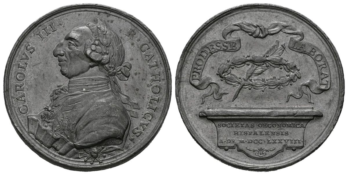 CARLOS III (1759-1788). Prize from the Real Seville Economic Society of Friends of the Country. (Pb. 41.91g / 40mm). 1778. Engraver: Tomás F. Prieto. (RAH 318 metal variation; MHE 362, same specimen). Anv: Laureate bust of Carlos IV on the left with jacket, band and necklaces of the fleece and of the order of Carlos III, around legend: CAROLVS III CATHOLICVS. Rev: Laurea and pen intertwined, above tape with legend: PRODESSE LABORAT, below on a pedestal inscribed: SOCIETAS OECONOMICA / HISPALENSIS / A DE MDCCLXXVIII. Almost Extremely Fine. Light tap.