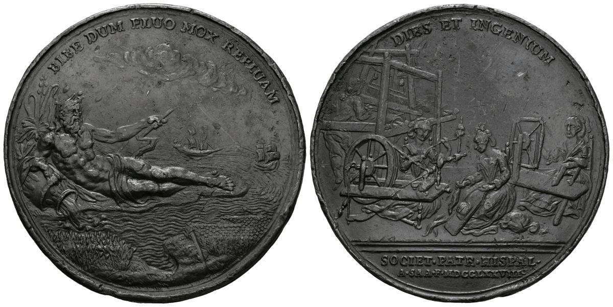 CARLOS III (1759-1788). Real Seville Economic Society of Friends of the Country. (Pb. 104.21g / 68mm). 1778. Engraver: A. de Saa. (RAH 315-316 metal variation). Anv: Guadalaquivir represented as an old man leaning to the right with a rudder and a jug from which the water flows towards the cultivated fields, in the background, under a large cloud, two ships sailing under sail, above the legend: BIBE DUM FLUO MOX REFLUAM. Rev: Two spinners and a carding machine with their utensils, in the bottom left, a weaver with his loom in operation, above the legend: DIES ET INGENIUM, in exergue: SOCIET PATR HISPAL / A SAA F MDCC LXXVIII. Very Fine. Strange.