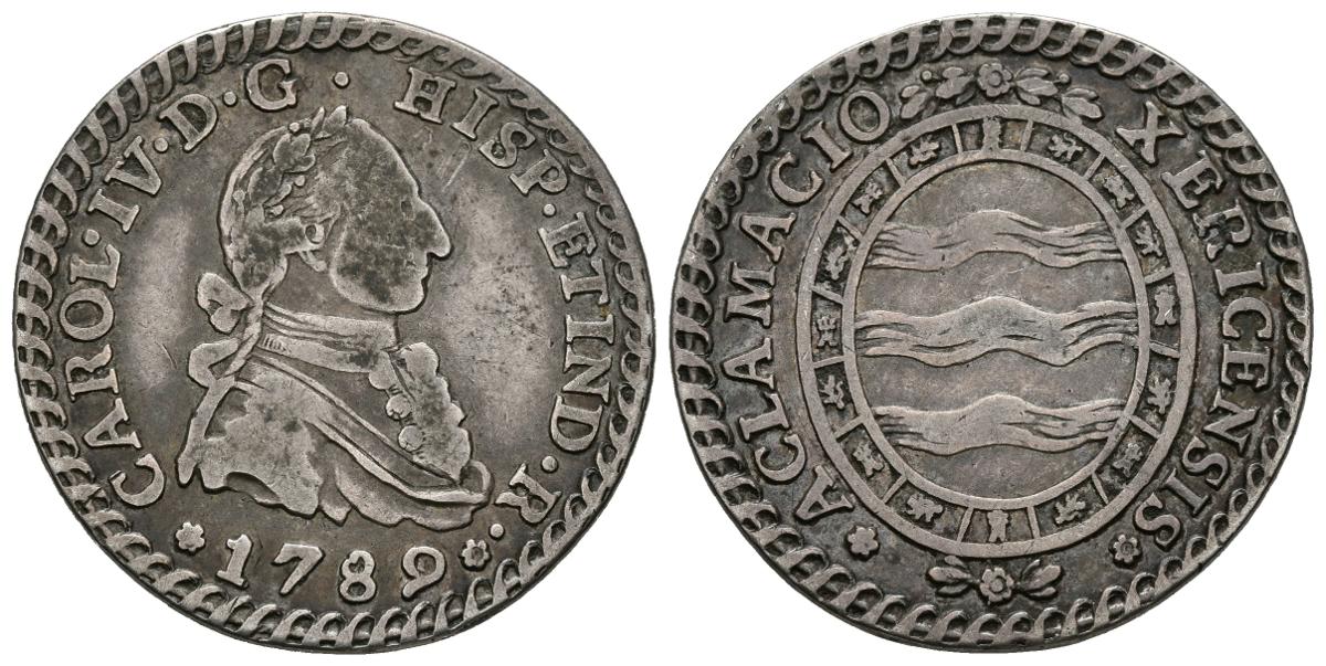 CARLOS IV (1788-1808). Proclamation in Jerez de la Frontera. Cadiz. (Ar. 5.70g / 26mm). 1789. Module of 2 Reales. (Vives 690; RAH 344). Anv: Laureate bust of Carlos IV with coat, jabot shirt, band and fleece collar, around legend: CAROL IV DG HISP ET IND R 1789. Rev: Oval Escudo with three waving bands, surrounded in embroidery by alternating castles and lions, above and below garland, around legend: ACLAMACIO XERICENSIS. Very Fine.