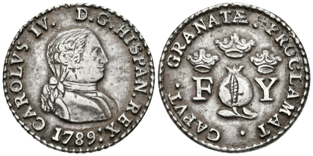 CARLOS IV (1788-1808). Proclamation in Granada. (Ar. 5.72g / 29mm). 1789. Molten silver. (You Vives 689). Ob: Bust with Carlos IV coat, around legend: CAROLVS IV DG HISPAN REX, under bust: 1789. Rev: crowned Granada, between crowned FY, around legend: CAPVT GRANATE PROCLAMAT. Good Very Fine. Strange.