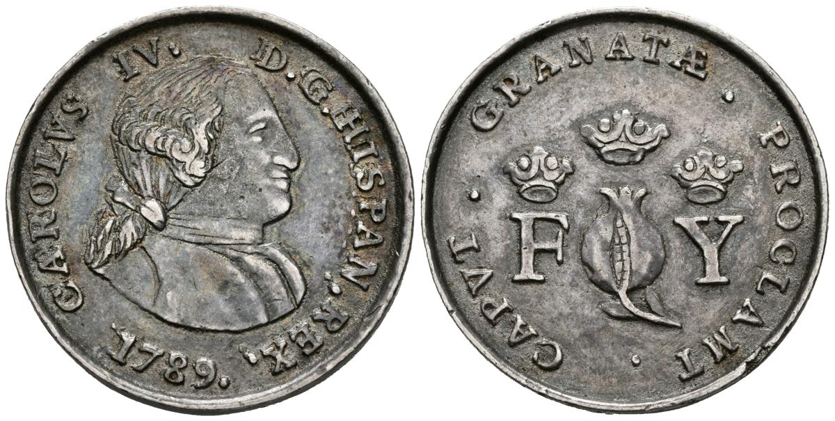CARLOS IV (1788-1808). Proclamation in Granada. (Ar. 12.55g / 36mm). 1789. Molten silver. (H-39). Ob: Bust of Carlos IV with coat, around legend: CAROLVS IV DG HISPAN REX, under bust: 1789. Rev: Granada crowned between letters FY crowned, around legend: CAPVT GRANATAE PROCLAMAT. Good Very Fine. Strange.