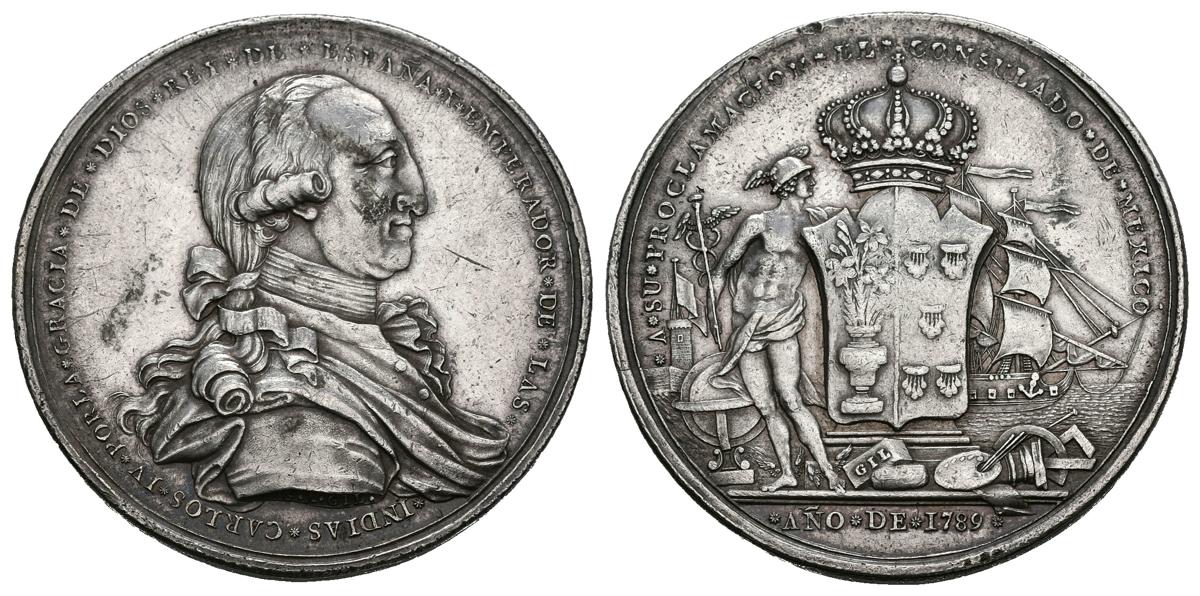English CARLOS IV (1788-1808). The consulate. Proclamation Medal. . (Ar. 29.29g / 42mm). 1789. Mexico. Engraver: GA Gil. (Vives 707; RAH 418 metal variation). Anv: Bust of Carlos IV with jacket, jacket and cloak, around the legend: CARLOS IV BY THE GRACE OF GOD, KING OF SPAIN AND EMPEROR OF THE INDIES. Rev: Escudo crowned divided with a jar of lilies and the five wounds of San Francisco, on the left Mercury supported with petaso and caduceus, at his feet attributes of science, art and commerce, behind a castle with a tower and a raised flag and on the right war frigate, around legend: TO ITS PROCLAMATION OF MEXICO, in exergue: YEAR OF 1789. Good Very Fine. Limited.