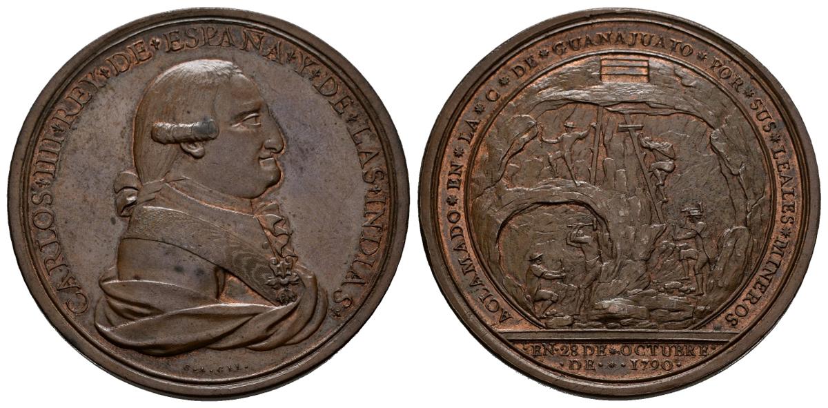 CARLOS IV (1788-1808). Proclamation of Carlos IV by the Miners of Guanajuato. (Ae. 43.84g / 47mm). Mexico. October 28, 1790. Engraver: GA GIL. (Vives 129; RAH 407). Anv: Bust of Carlos IV to the right, beardless, with wig and ponytail with jacket, jabot, band and cloak, around the legend: CARLOS IIII REY DE ESPAÑA Y DE LAS INDIAS. Rev: Perspective of the interior of a mine where several operators are in charge of cutting and removing mining, around the legend: ACCLAIMED IN THE C OF GUANAJUATO BY ITS LOYAL MINERS, in exergue: ON OCTOBER 28 / OF 1790. Good Very Fine. Pretty and scarce.