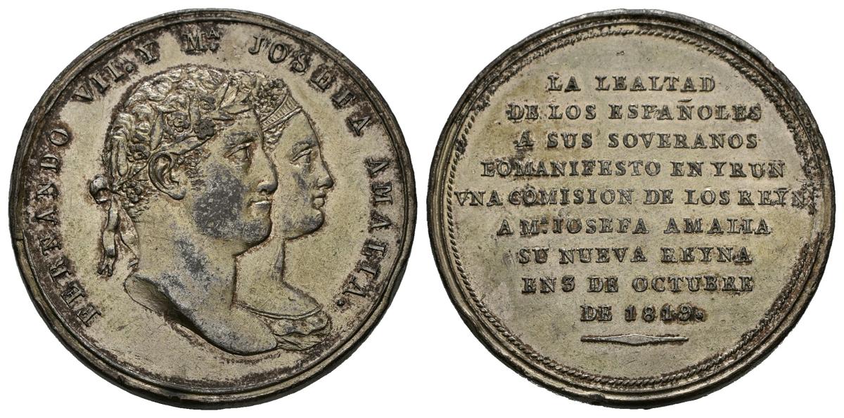 FERNANDO VII (1808-1833). Wedding of Fernando VII and María Josefa Amalia. (Gilt bronze. 33.94g / 36mm). 1819. Irún. Yrún's manifesto of loyalty to María Josefa Amalia, new Queen. (You Vives 331 metal variation). Anv: Busts of Fernando VII and María Josefa Amalia on the right, around the legend: FERNANDO VII AND Mª JOSEFA AMALIA. Rev: Legend: THE LOYALTY / OF THE SPANIARDS / TO THEIR SOVEREIGNERS / IT MANIFESTS IN YRUN / VNA COMMISSION OF THE KINGS / TO Mª JOSEFA AMALIA / HIS NEW KINGDOM / ON OCTOBER 3 / DE 1819. Almost Extremely Fine.
