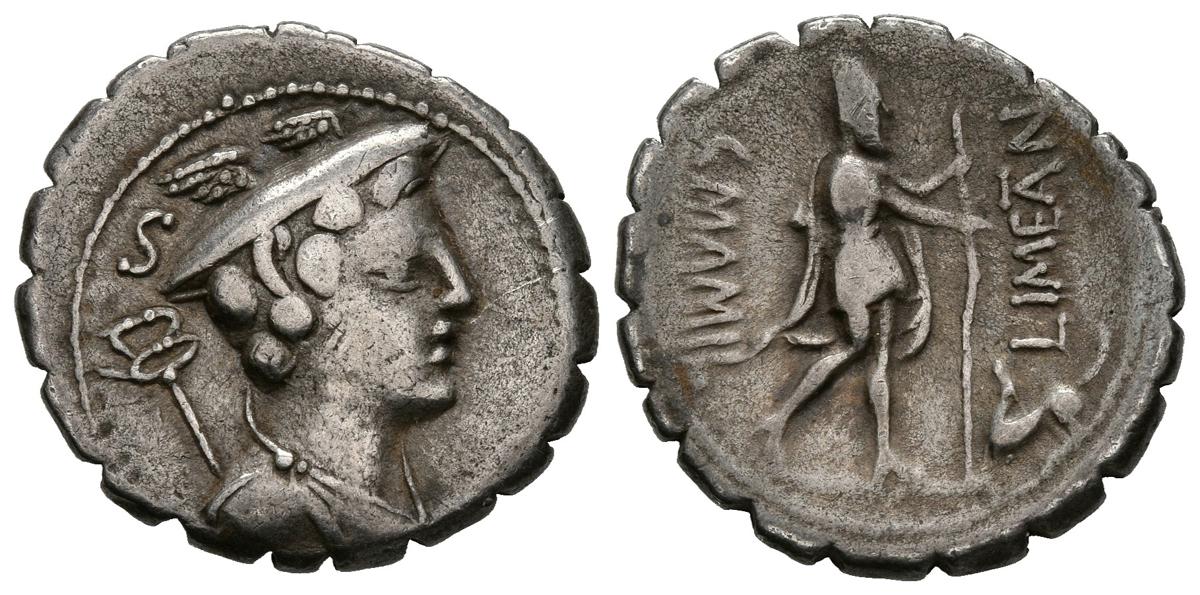 GENS MAMILIA. Denarius. (Ar. 3.78g / 20mm). 82 BC Auxiliary Workshop of Rome. (FFC 835; Crawford 362/1). Anv: Bust of Mercury on the right, back caduceus and letter: S. Rev: Ulysses on the right with dog in front, front and back legend: C MAMIL LIMETAN. Very Fine.