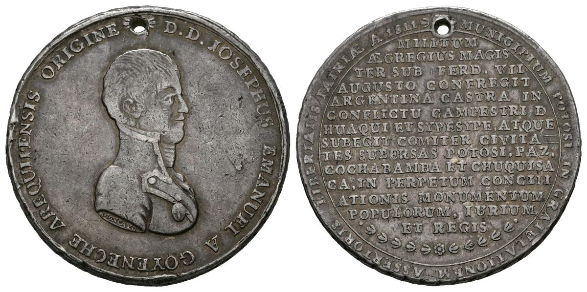 FERNANDO VII (1808-1833). The city of Potosí to José Manuel Goyeneche, winner of the Battle of the Desaguadero River. (Ar. 42.25g / 43mm). 1811. Potosí. (You Vives 289). Anv: Bust of General Goyoneche cpm warrior, jabot shirt and plaque of Santiago, around legend: DD JOSEPHUS EMANUELA GOYONECHE AREQUIENSIS ORIGINE. Rev: Legend MILITUM / AEGREGIUS MAGIS / TER SUB FERD VII / AUGUSTUS CONFREGIT / ARGENTINA CASTRA IN / CONFLITU CAMPESTRI D / HUAQUI ET SYPESYPE, ATQUE / SUBEGIT COMMITER CIVITA / TES SUBERSAS REGISTER POTUROSI, PAZ; / COCHIUS floral garland POTUROSI, PAZ; I around legend: municipium POTOSI IN GRATULATIONEM ASSERTORIS libertatis PATRIAE A 1811. Very Fine. Hole at 12 o'clock. Strange.