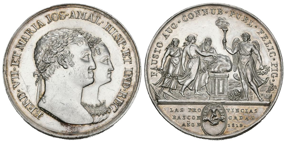 English FERNANDO VII (1808-1833). Wedding of Fernando VII and María Josefa Amalia. (Ar. 53.30g / 38mm). 1819. Tribute to the Basque Provinces. (You Vives 332). Anv: Busts of Fernando VII and María Josefa Amalia on the right, around the legend: FERD VII ET MARIA JOS AMAL HISP IND REG. Rev: Central altar lit, on the right winged figure with a torch and laurel wreath, on the left three female figures with garland, above legend: FAUSTO AUG CANNUB PUBL FELICI PIG, in exergue: oval with three joined hands, on both sides legend: LAS PRO-VINCIAS / BASCON-GADAS / YEAR D-1819. Good Extremely Fine. Cleaned.