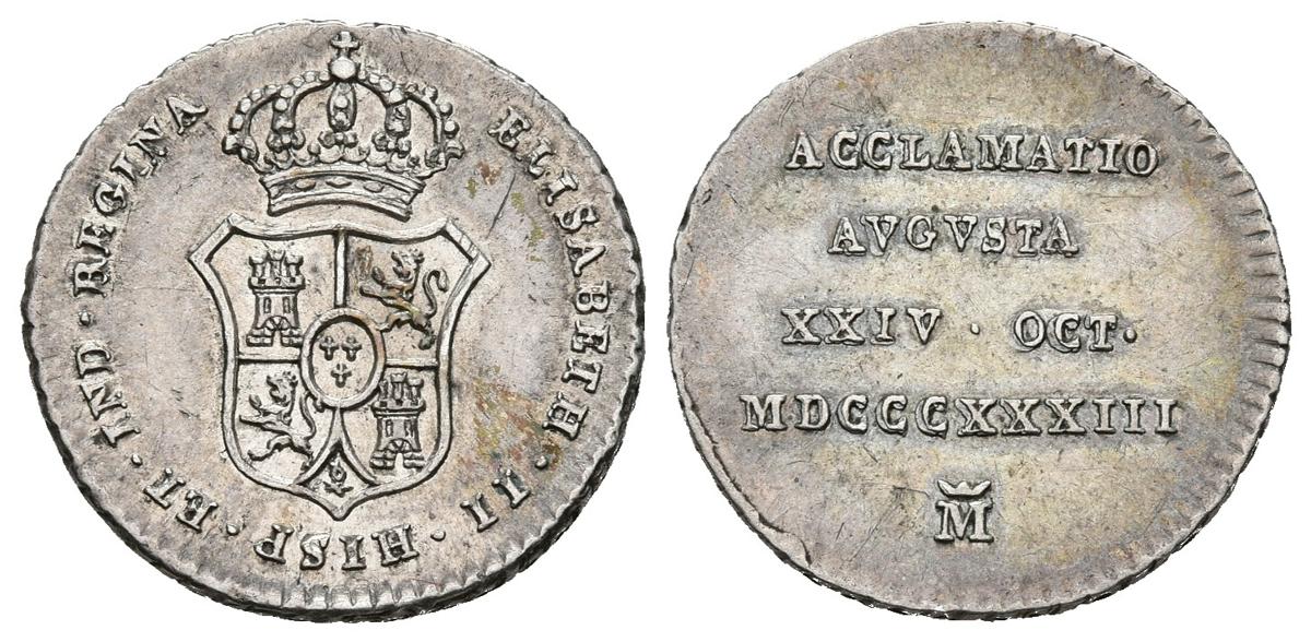 ISABEL II (1833-1868). Proclamation in Madrid. (Ar. 1.45 / 15mm). October 24, 1833. Module of 1/2 Real. (Cayon 16789). Extremely Fine.