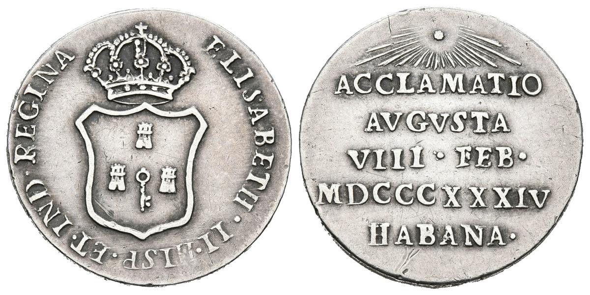 ISABEL II (1833-1868). Proclamation in Havana, Cuba. (Ar. 4.12g / 21mm). February 8, 1834. (You Vives 767). Good Very Fine.