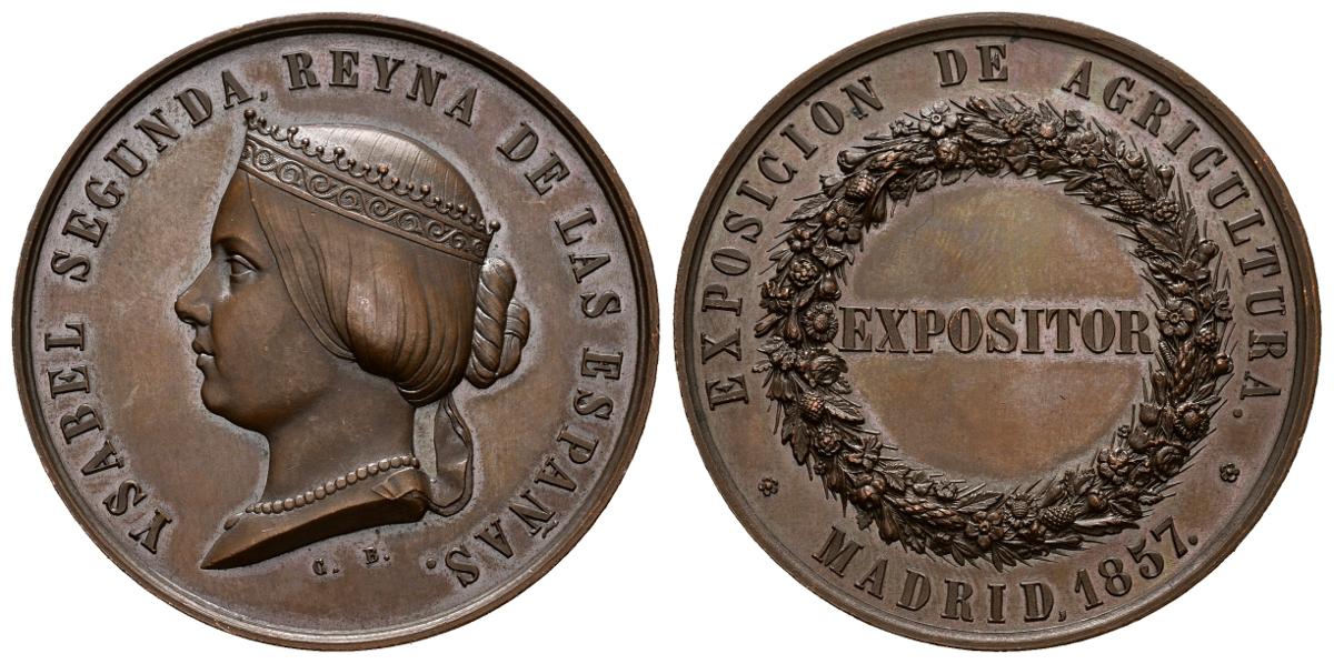 ISABEL II (1833-1868). Agriculture Exhibition. Exhibitor. (Ae. 40.24g / 43mm). 1857. Madrid. Engraver: CB (Louis Charles Bouvet). In song Cuivre. (National Heritage 684). Good Extremely Fine.