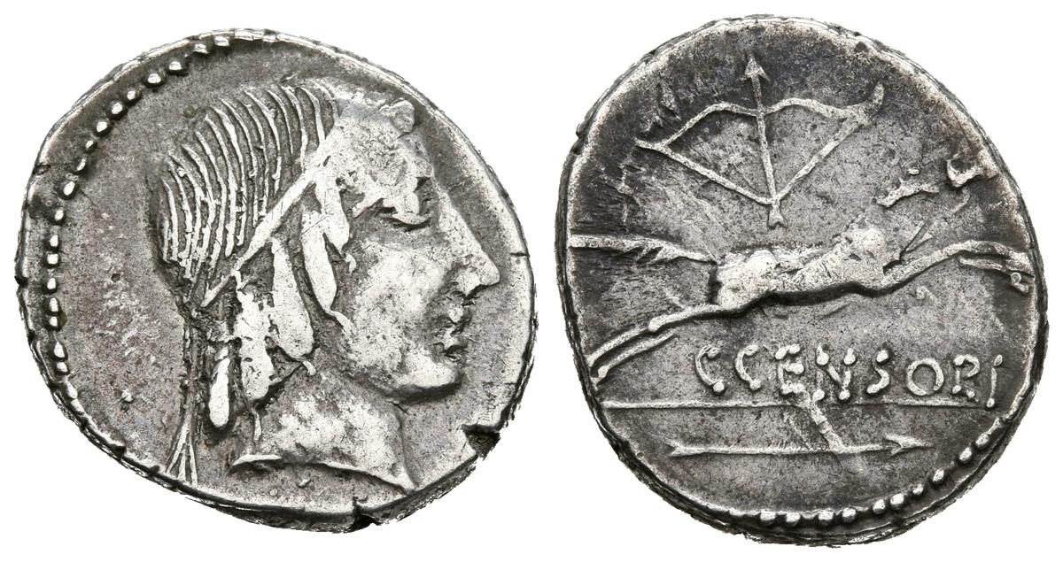 GENS MARCIA. Denarius. (Ar. 3.95g / 18mm). 88 BC Unclear mintage. (FFC 864; Crawford 346 / 2b). Anv: Diademic head of Apollo on the right. Rev: Horse to the right, above bow, below legend: C CENSORI, in exergue arrow. Almost Very Fine.