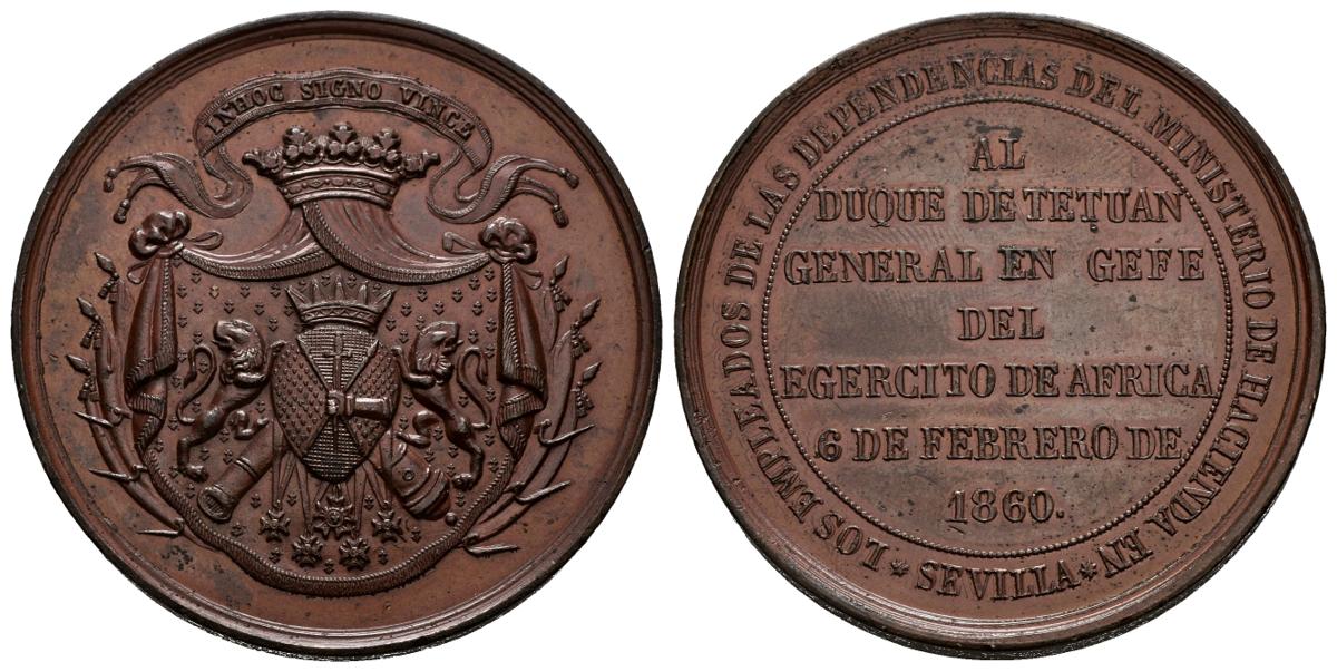 ISABEL II (1833-1868). To the Duke of Tetouan. Employees of the Ministry of Finance of Sevilla. (Ae. 57.61g / 48mm). 1860. Anonymous. (VQ 14346). Extremely Fine. Marquitas.